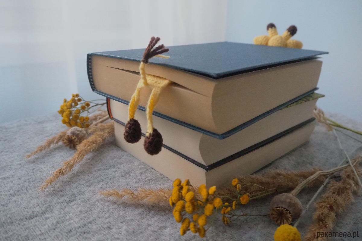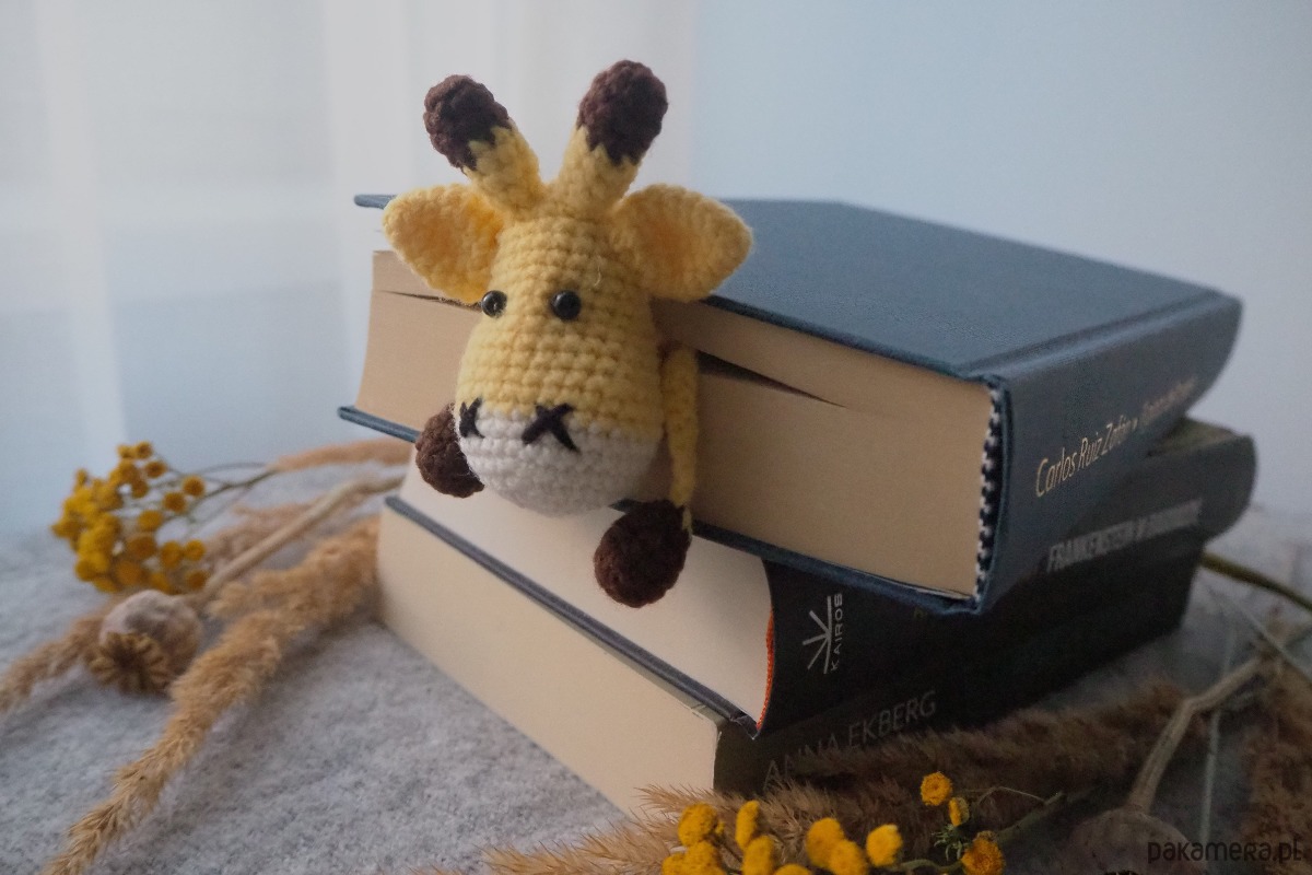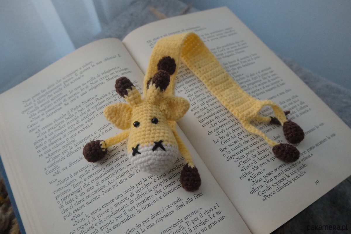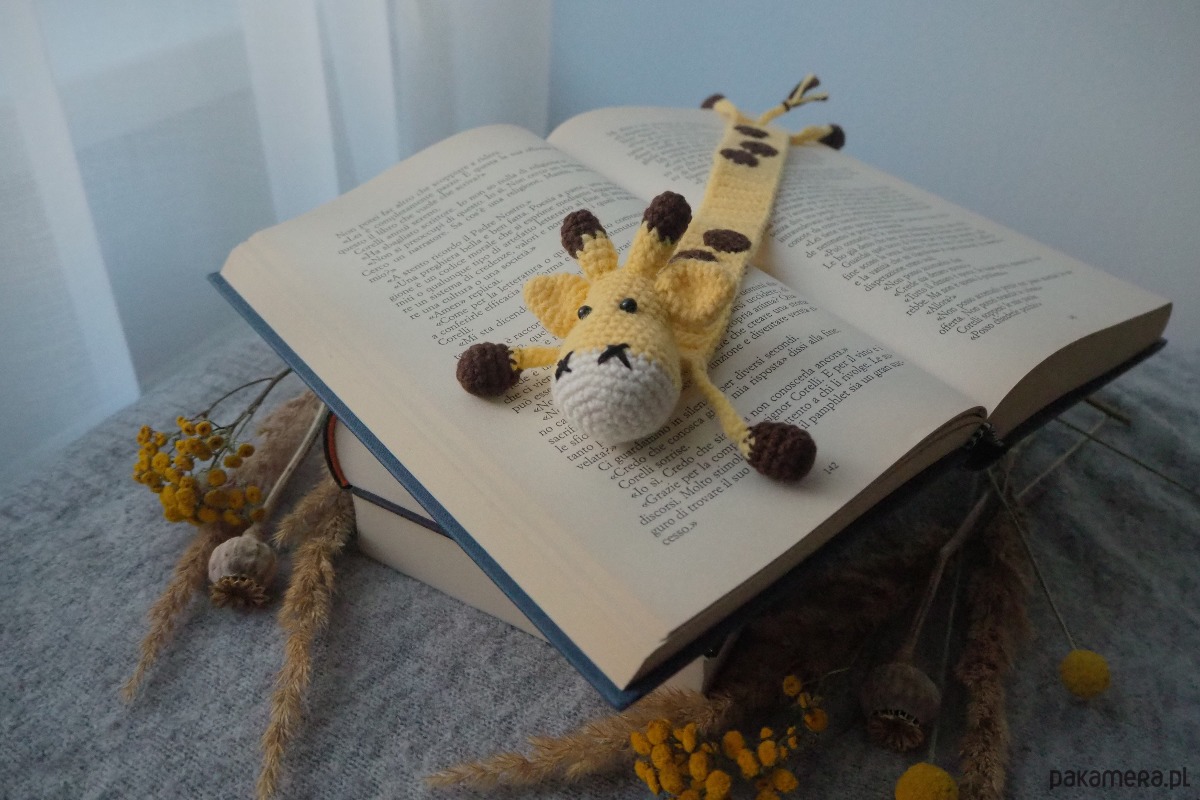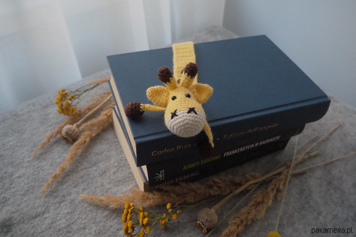 Zakładka do książki z sympatyczną żyrafą wykonana z włóczki na szydełku.