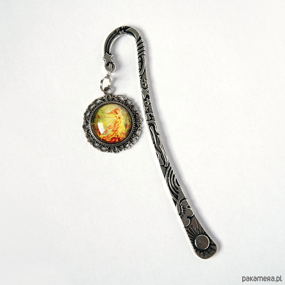 Grafika ukryta w pięknie zdobionej zakładce do książki pod osłoną przeźroczystego półokrągłego szkiełka.