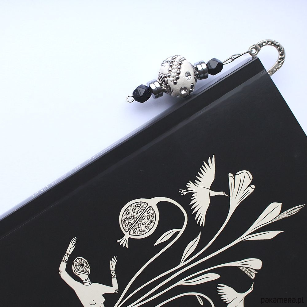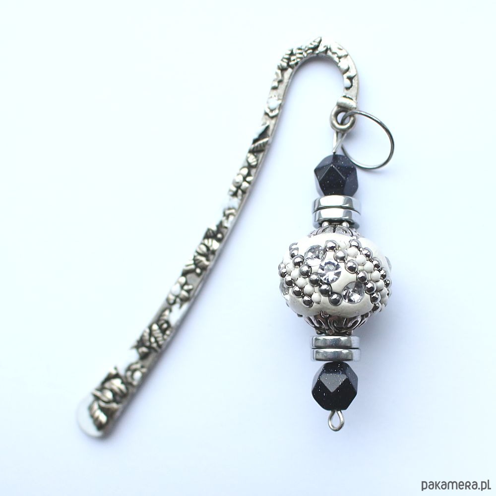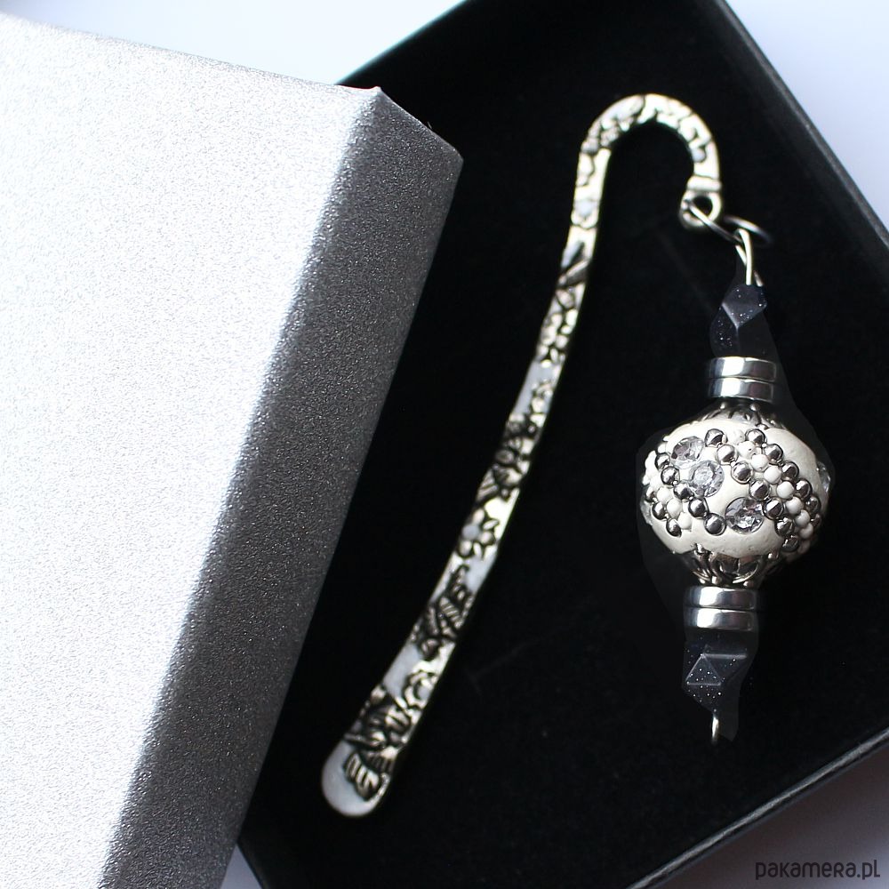 Elegancka mini zakładka do książki wykonana ręcznie, ozdobiona efektownym, bogato zdobionym koralikiem w odcieniu bieli i srebra oraz kostkami nocy Kairu i hematytem.