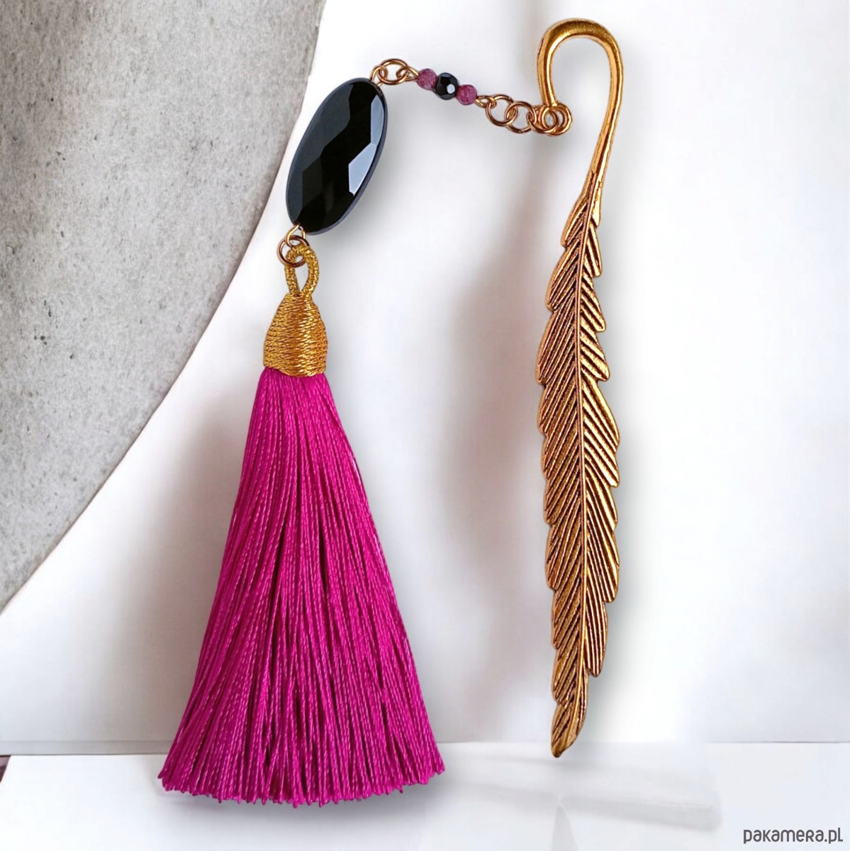 Duuuży, fasetowany onyks (aż 25mm!), RUBIN - fasetowane kuleczki 3mm, fasetowany onyks 4mm, okazały chwost w kolorze fuksjowym. baza zakładki - metal w kolorze złota. pozostałe elementy metalowe wykonane z pozłacanej stali szlachetnej. wszystkie poszczególne elementy są ruchome, więc zakładka będzie się ładnie układała. długość samej zakładki (bazy): ok.12cm. .. dł. całego elementu wiszącego: ok.17cm.
