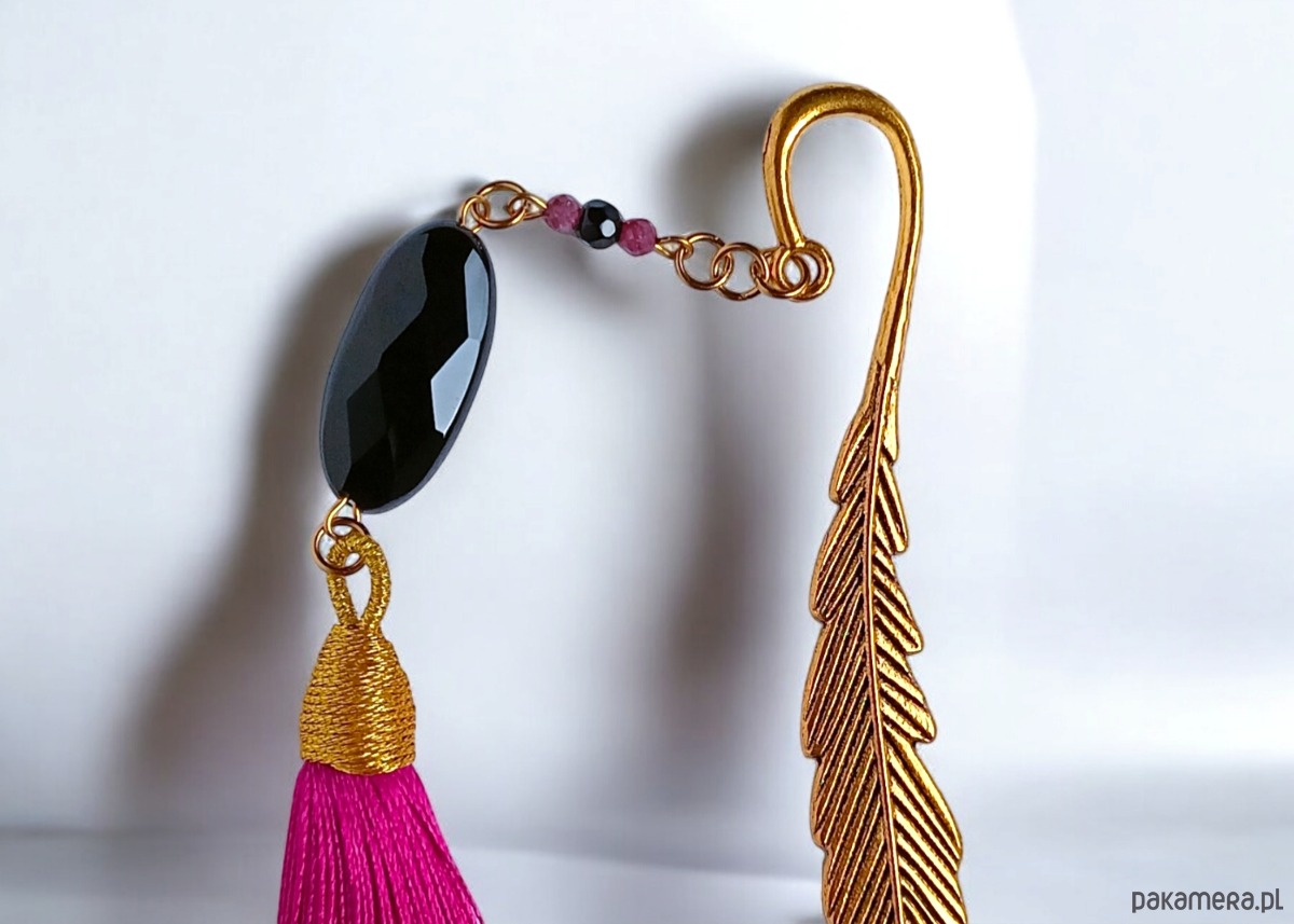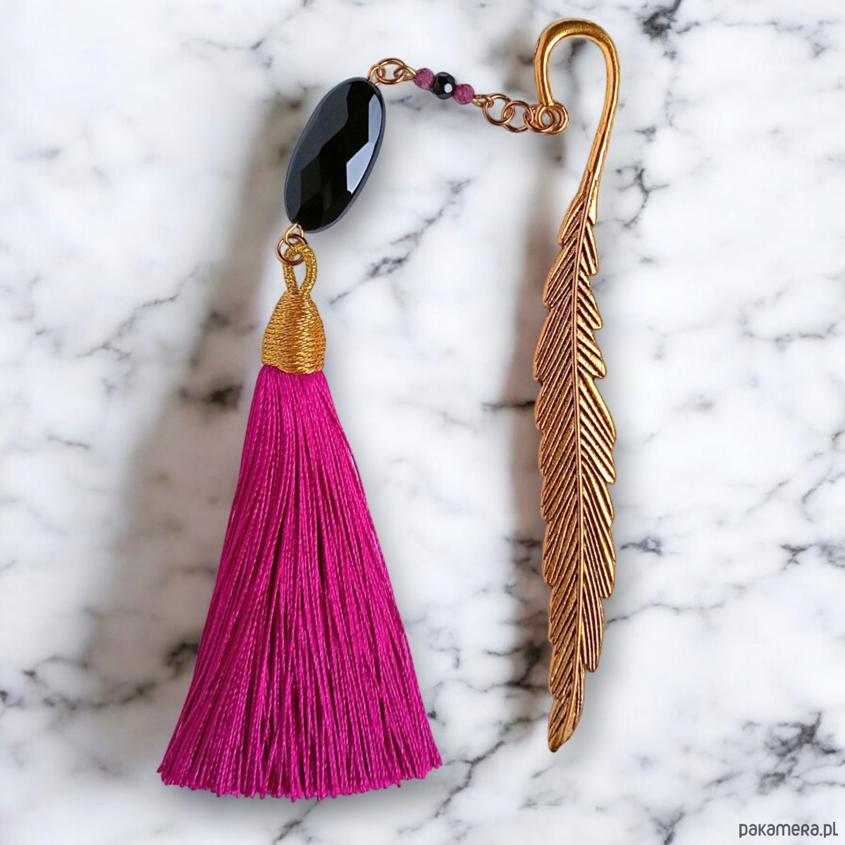 Duuuży, fasetowany onyks (aż 25mm!), RUBIN - fasetowane kuleczki 3mm, fasetowany onyks 4mm, okazały chwost w kolorze fuksjowym. baza zakładki - metal w kolorze złota. pozostałe elementy metalowe wykonane z pozłacanej stali szlachetnej. wszystkie poszczególne elementy są ruchome, więc zakładka będzie się ładnie układała. długość samej zakładki (bazy): ok.12cm. .. dł. całego elementu wiszącego: ok.17cm.