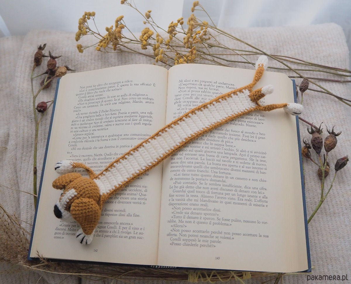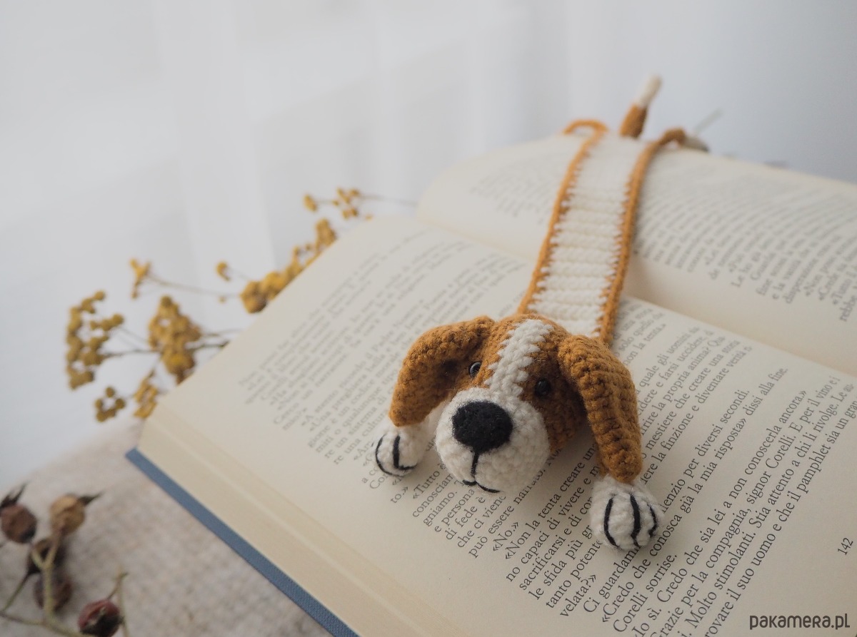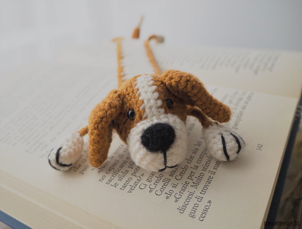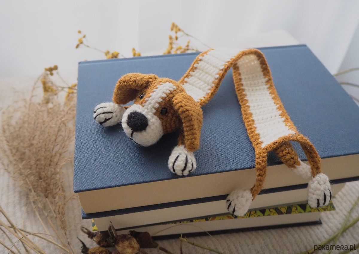 Zakładka do książki z sympatycznym pieskiem wykonana z włóczki na szydełku.