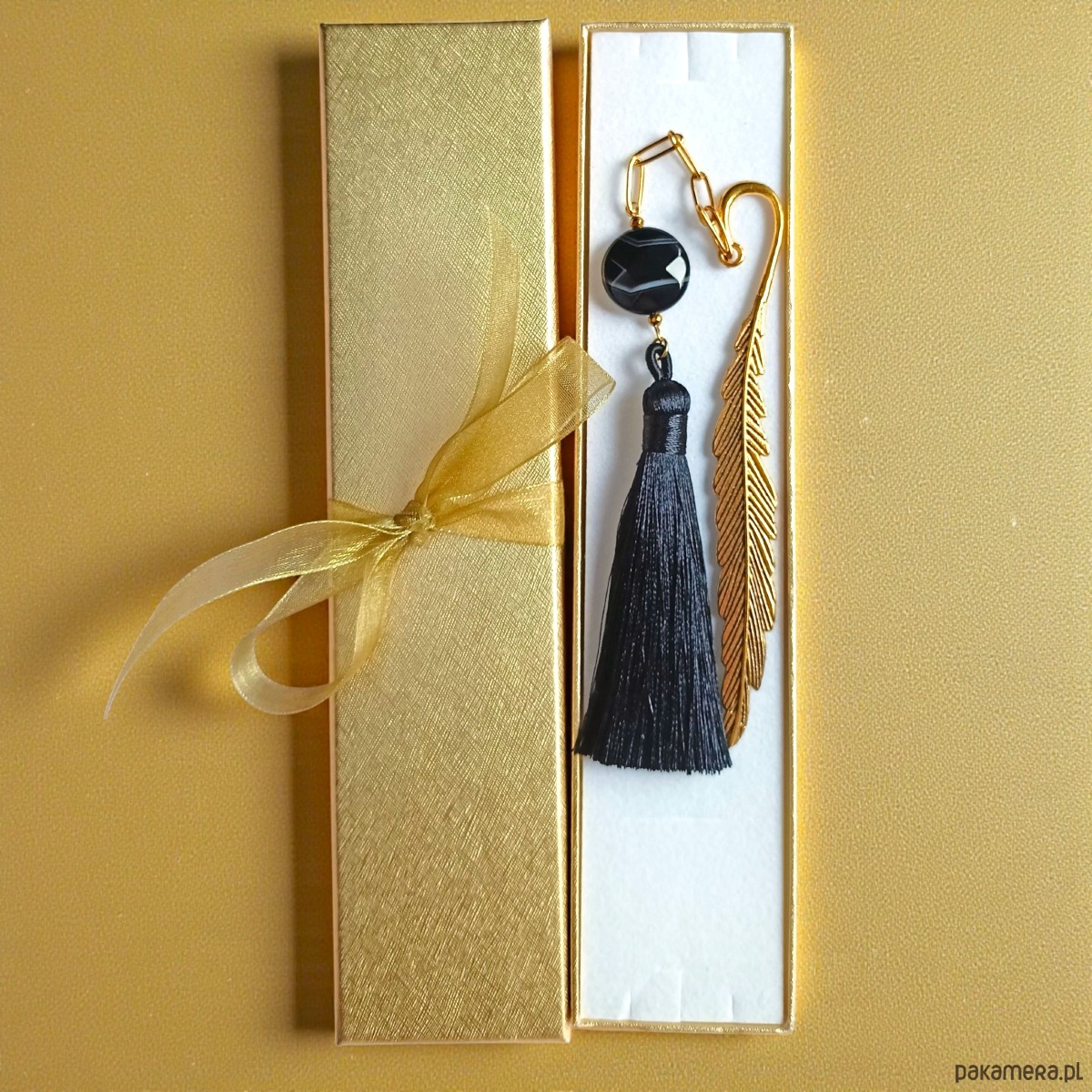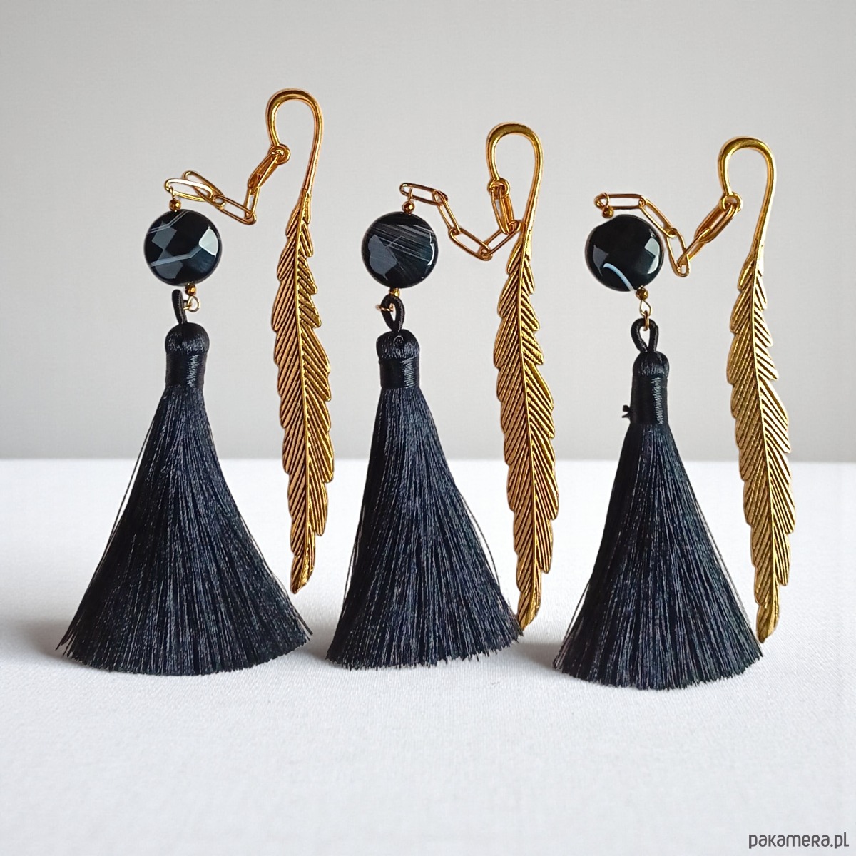 Fasetowany czarny agat ok.18mm, HEMATYT złoty, okazały chwost w kolorze czarnym, metal w kolorze złota (baza), łańcuch: stal szlachetna, pozłacana. wszystkie poszczególne elementy są ruchome, więc zakładka będzie się ładnie układała. długość samej zakładki (bazy): ok.12cm. .. dł. elementu wiszącego: ok.16cm.