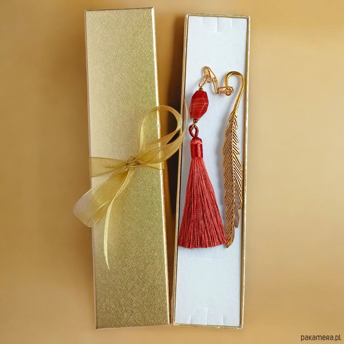 Eleganckie, złote pudełko, dodatkowo przewiązane wstążką.