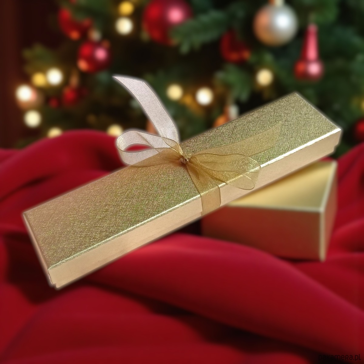 Eleganckie, złote pudełko, dodatkowo przewiązane wstążką.