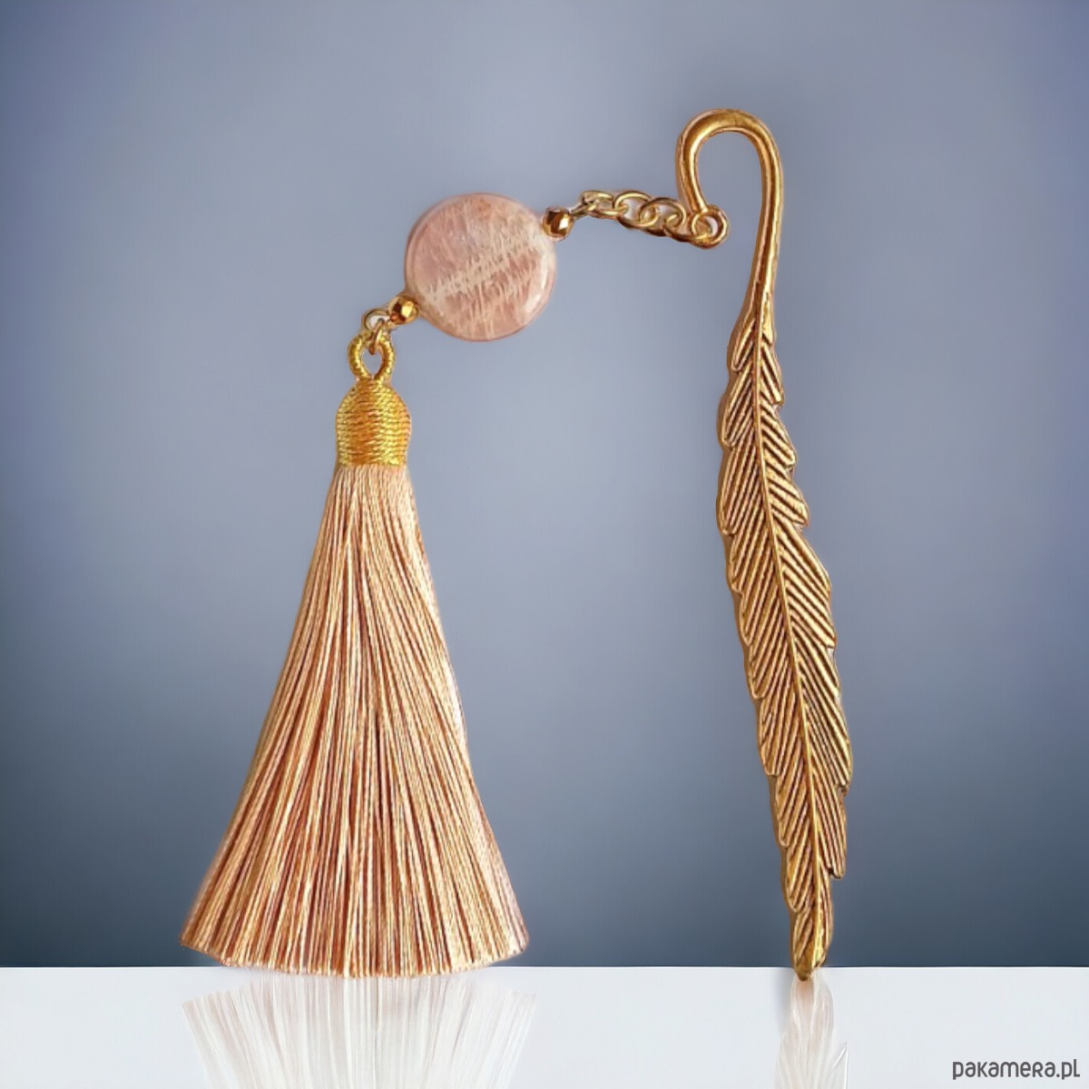 Kamień słoneczny ok.2cm, HEMATYT złoty, okazały chwost w kolorze beżowym, metal w kolorze złota. wszystkie poszczególne elementy są ruchome, więc zakładka będzie się ładnie układała. długość samej zakładki (bazy): ok.12cm. .. dł. całego elementu wiszącego: ok.17cm.