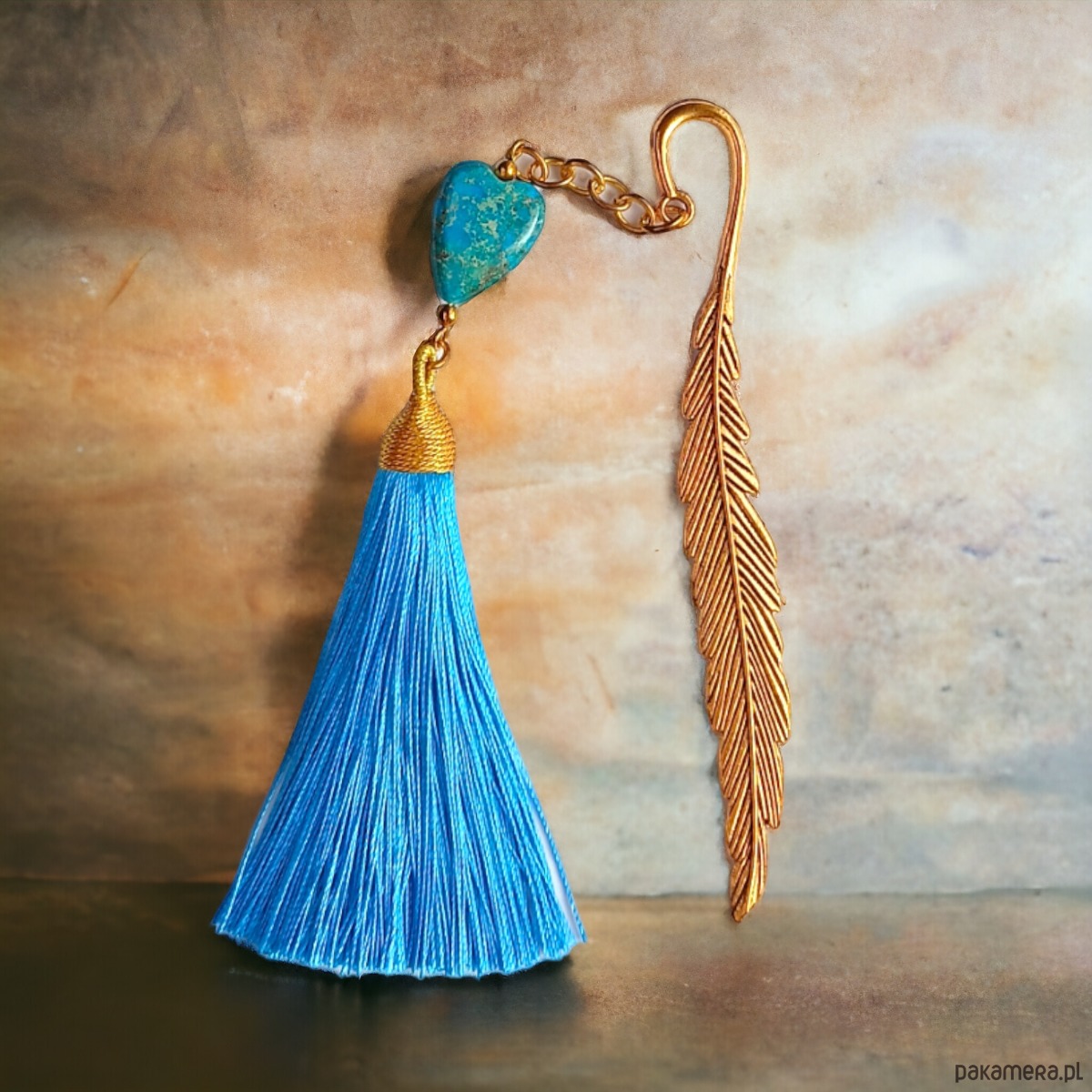 Serce z jaspisu cesarskiego ok.2cm, HEMATYT złoty, okazały chwost w kolorze turkusowm, metal w kolorze złota. wszystkie poszczególne elementy są ruchome, więc zakładka będzie się ładnie układała. długość samej zakładki (bazy): ok.12cm. .. dł. całego elementu wiszącego: ok.17cm.