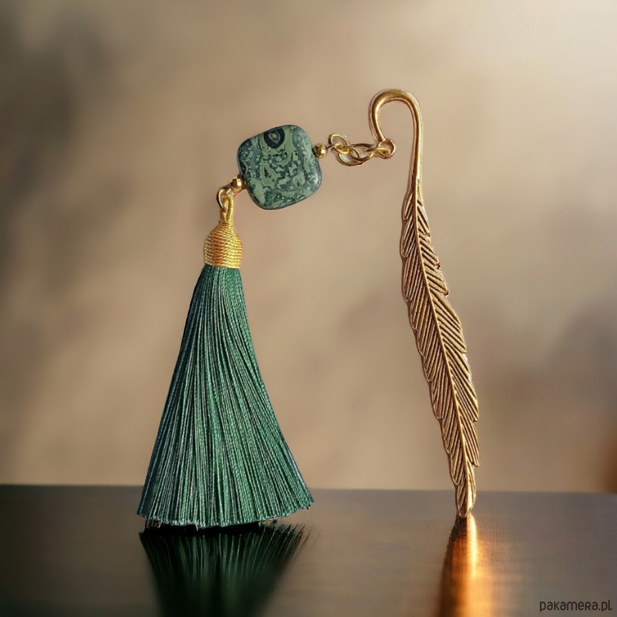 Jaspis kambaba ( w odcieniach ciemnej zieleni i czerni) ok.2cm, HEMATYT złoty, okazały chwost w kolorze ciemno zielonym, metal w kolorze złota. wszystkie poszczególne elementy są ruchome, więc zakładka będzie się ładnie układała. długość samej zakładki (bazy): ok.12cm. .. dł. całego elementu wiszącego: ok.17cm.
