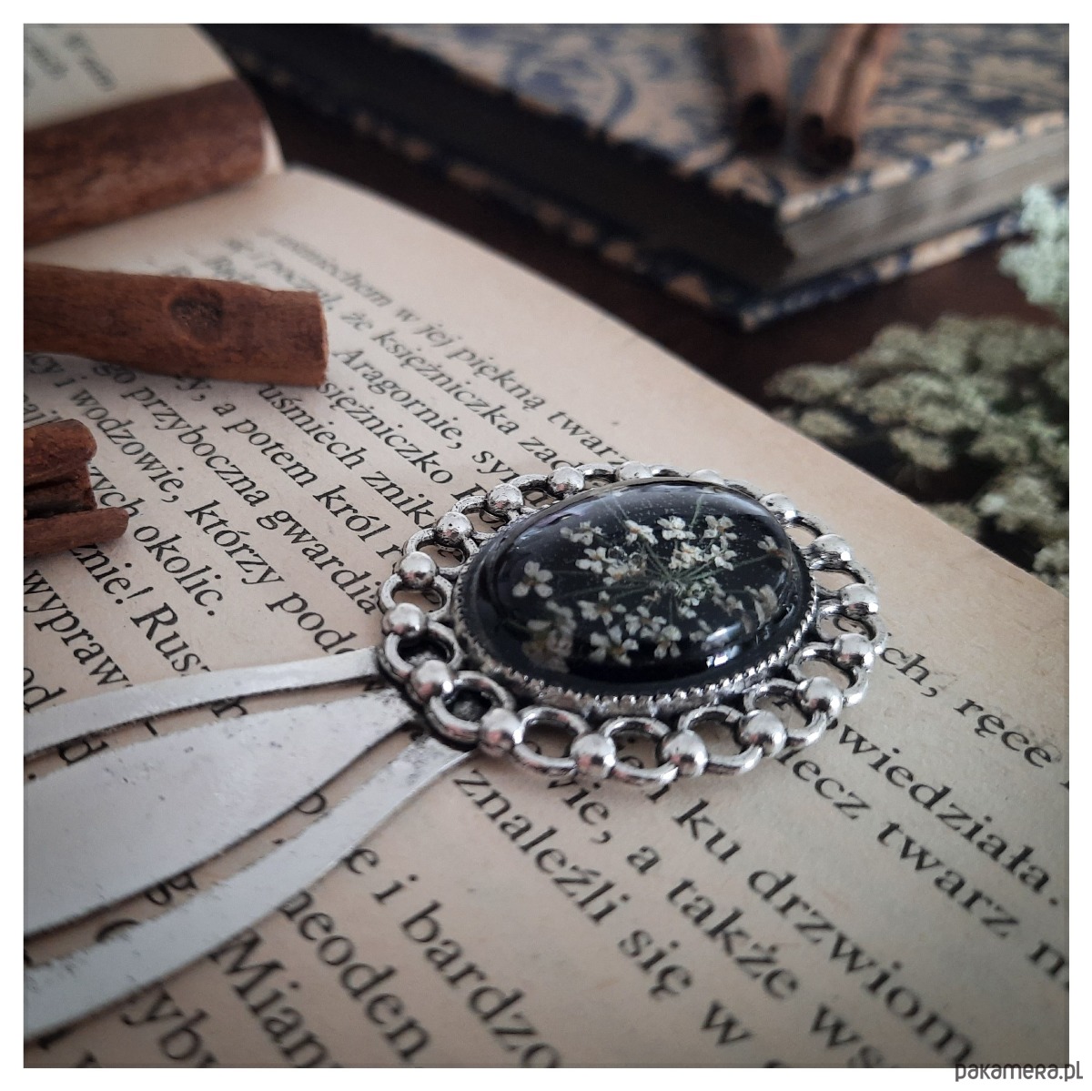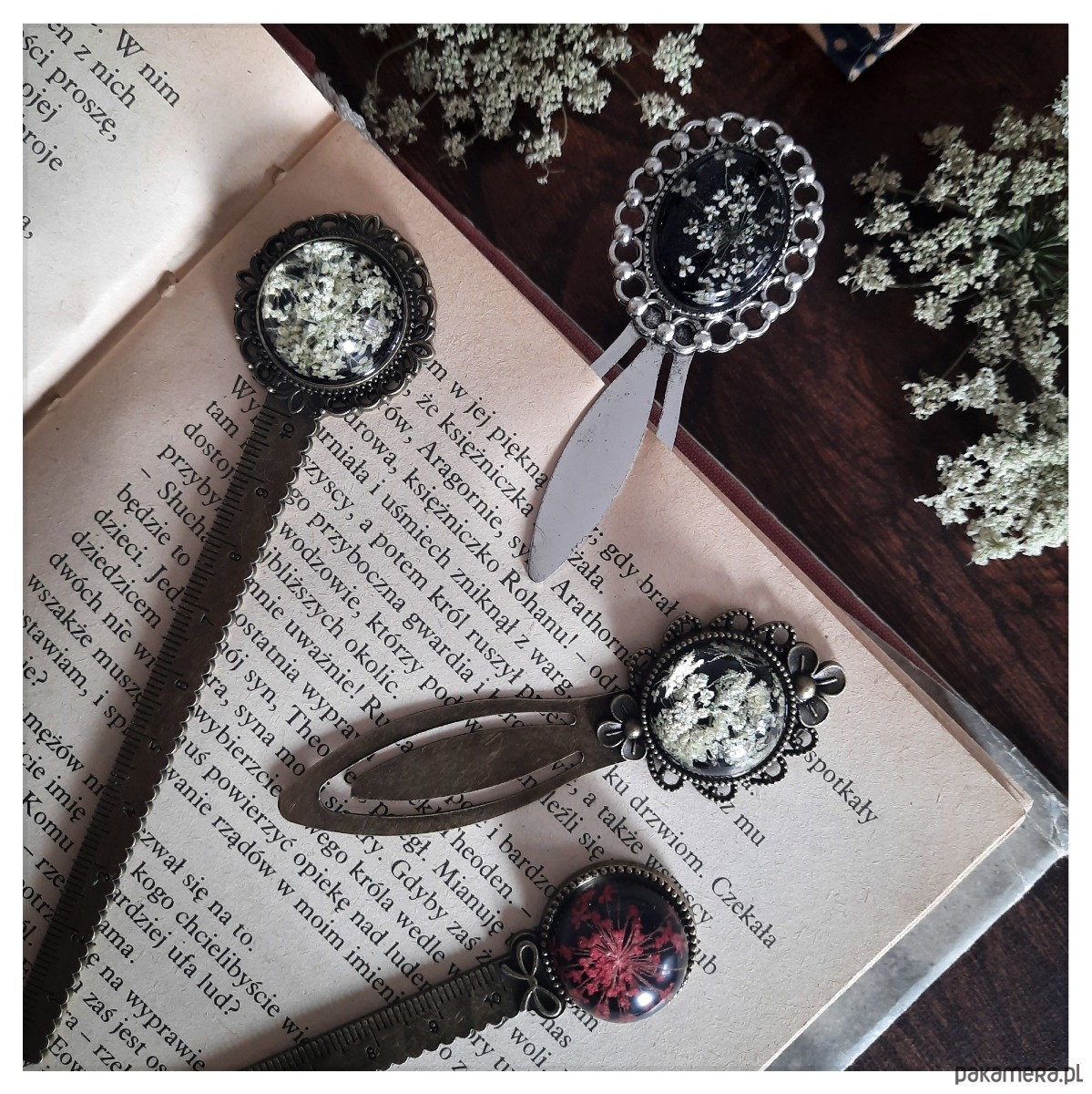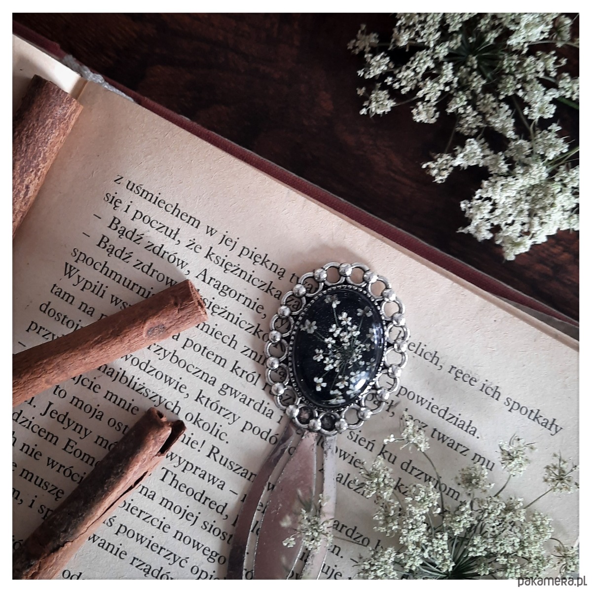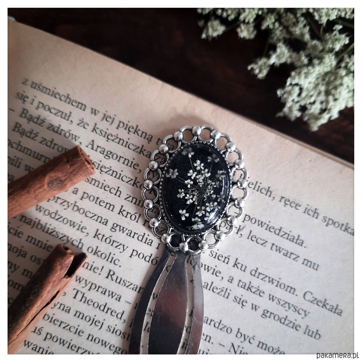 Zakładka z płatkami dzikiej marchwi zatopionymi w żywicy epoksydowej.