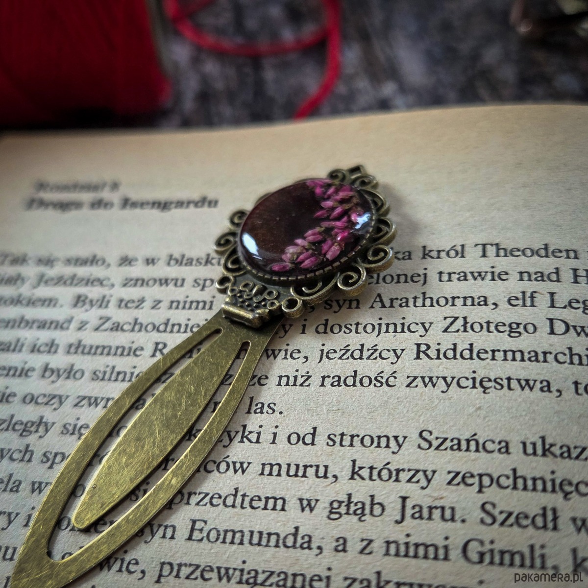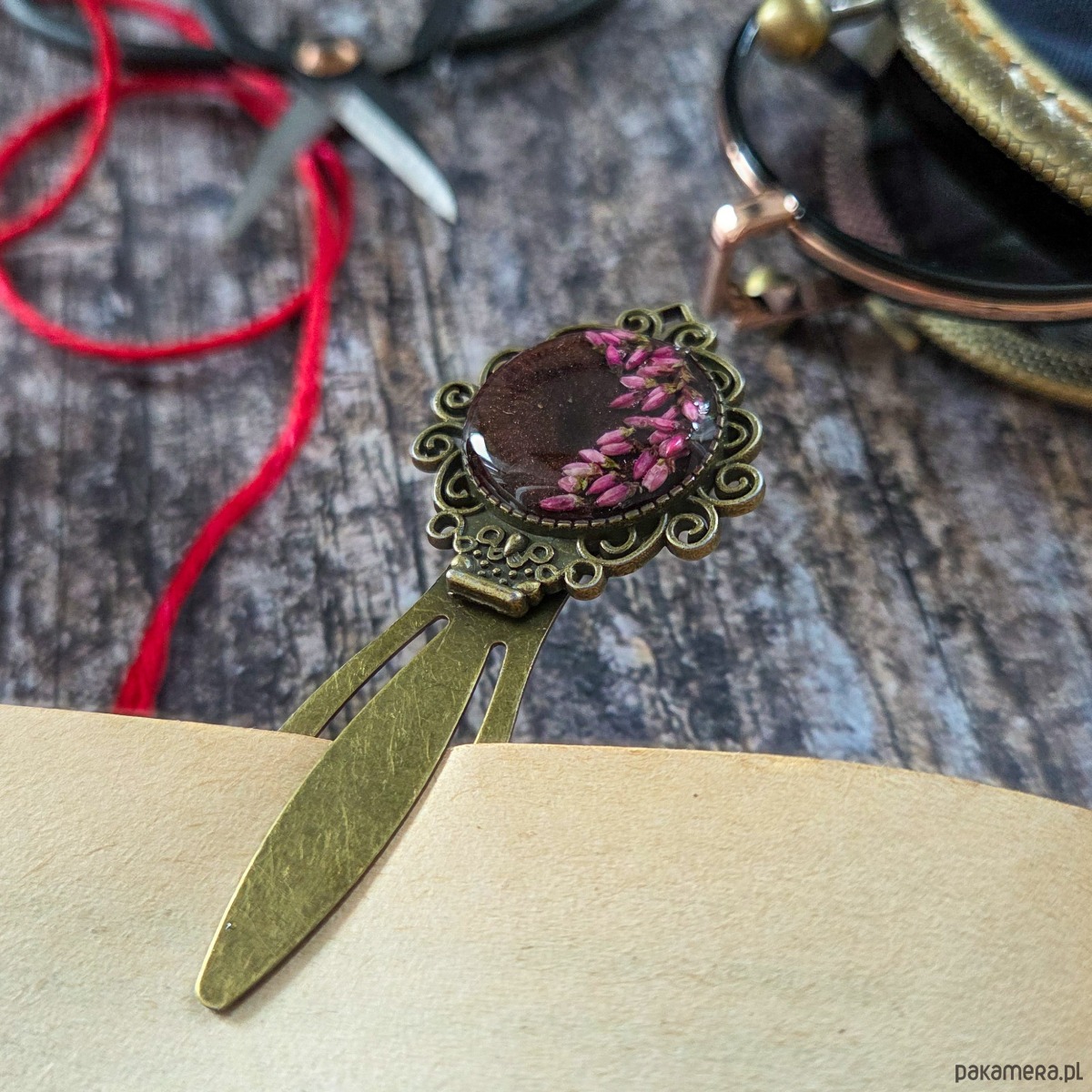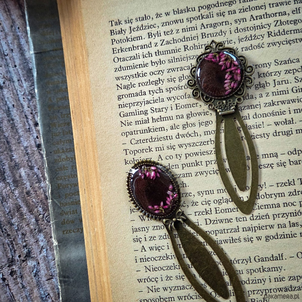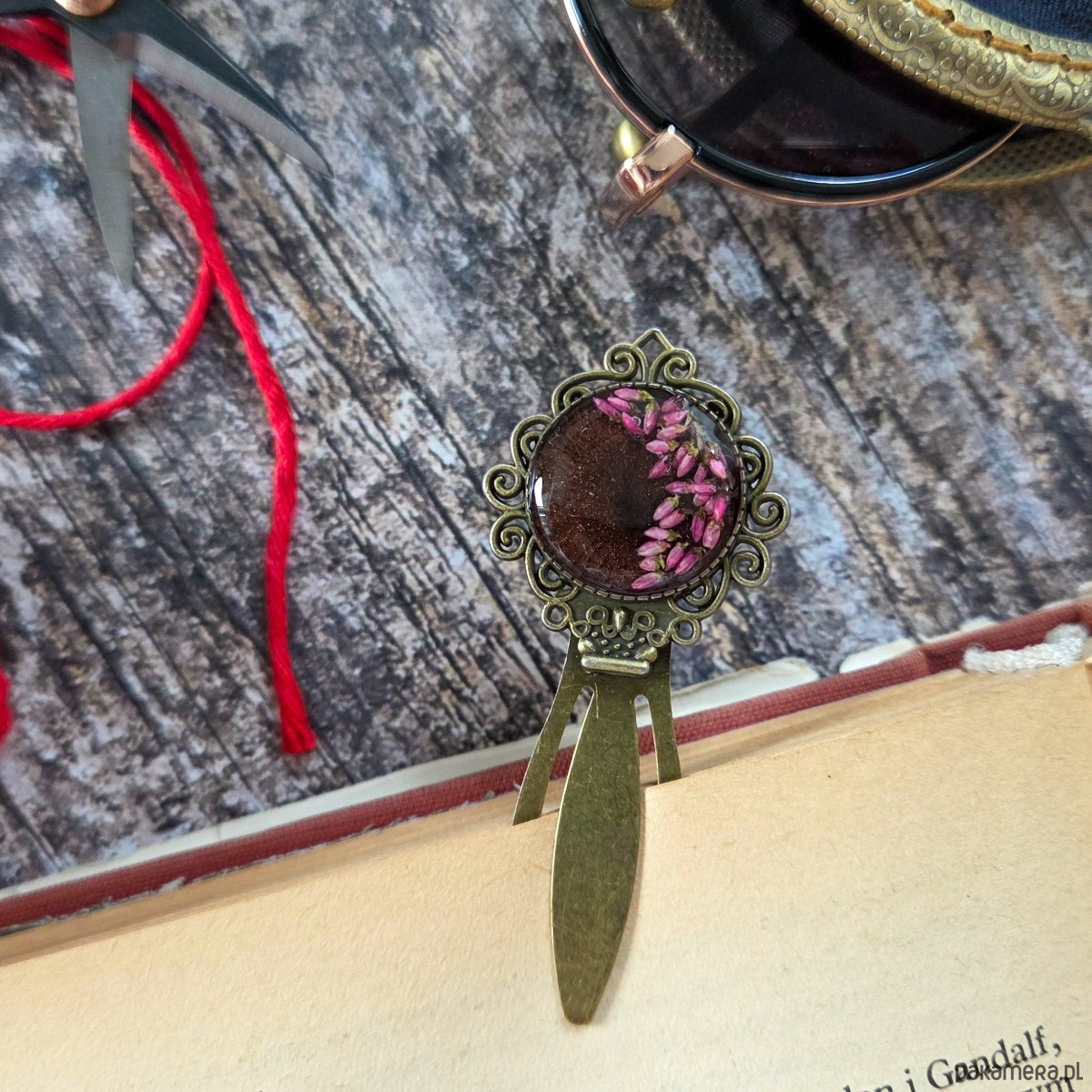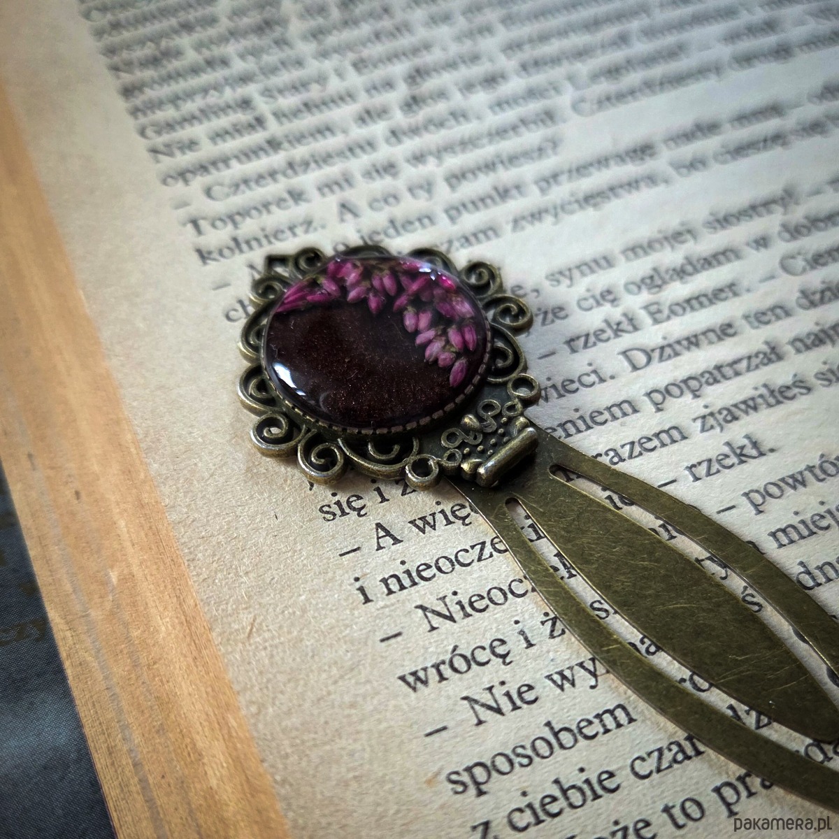 Zakładka z płatkami wrzosu zatopionymi w żywicy epoksydowej.