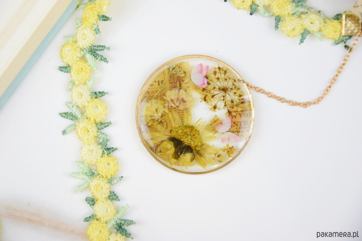 Lekki, metalowy łańcuszek wieńczy żywiczna zawieszka – niczym zamrożony w czasie mikroświat – kryjący suszone kwiaty, uchwycone w pełnym rozkwicie i zatrzymane w krysztale żywicy.