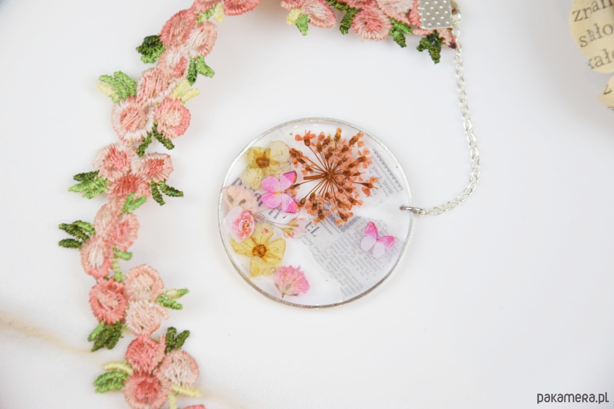 Lekki, metalowy łańcuszek wieńczy żywiczna zawieszka – niczym zamrożony w czasie mikroświat – kryjący suszone kwiaty, uchwycone w pełnym rozkwicie i zatrzymane w krysztale żywicy.