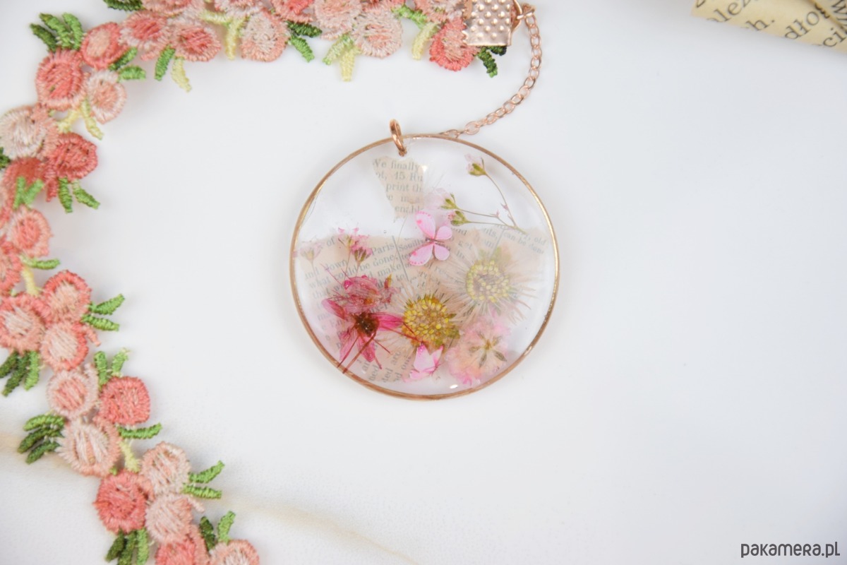Lekki, metalowy łańcuszek wieńczy żywiczna zawieszka – niczym zamrożony w czasie mikroświat – kryjący suszone kwiaty, uchwycone w pełnym rozkwicie i zatrzymane w krysztale żywicy.