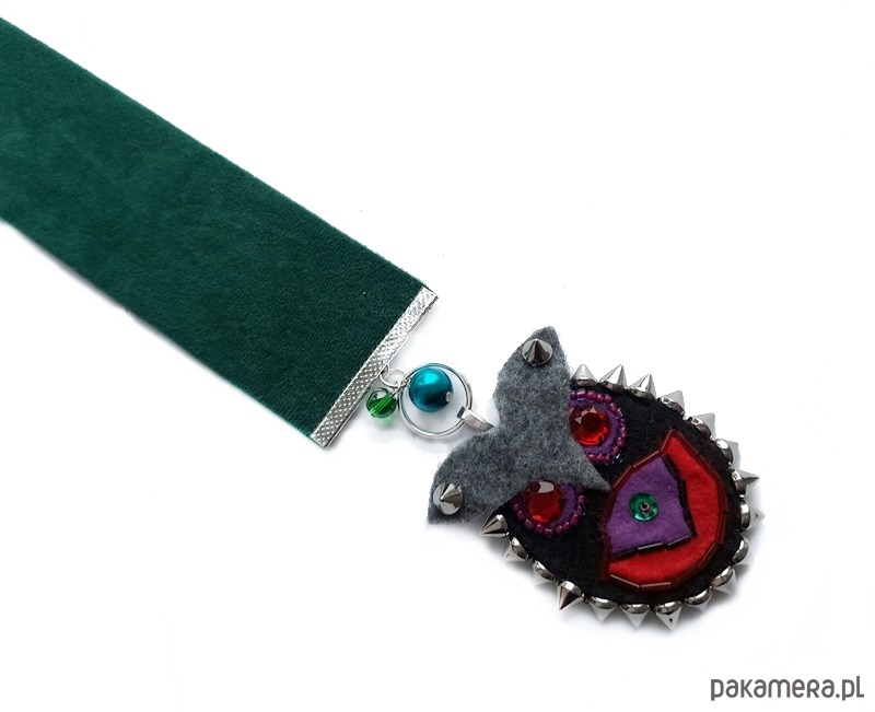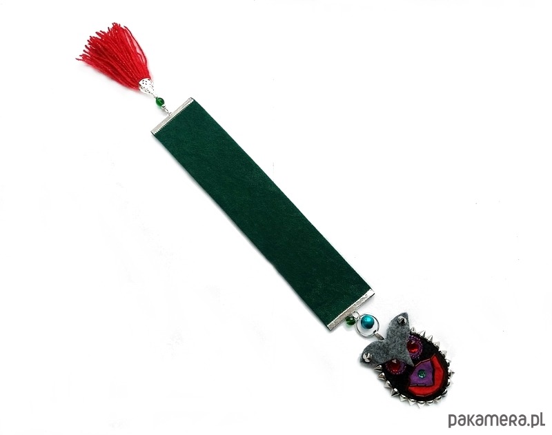 Zakładka do książki uszyta z przyjemnej w dotyku tkaniny przypominającej welur. Jej ozdobą jest wyszywana ręcznie sowa. Sowa z filcu może być odpięta i posłużyć jako brelok do plecaka, torebki czy kluczy.