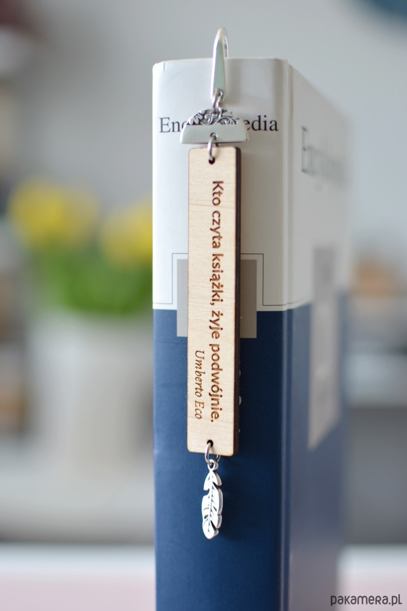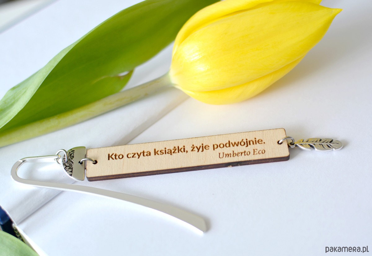 Elegancka zakładka do książki wykonana z półkolistego, ozdobnego elementu cynowego o wymiarach 18x10mm oraz podwieszonej pod nim prostokątnej tabliczki o wymiarach 80x14mm, wykonanej z drewnianej sklejki o grubości 3mm w kolorze naturalnym i zakończona podwieszką cynową w kształcie piórka (22x7m). Na drewienku wypalony został cytat Umberto Eco:"Kto czyta książki, żyje podwójnie".