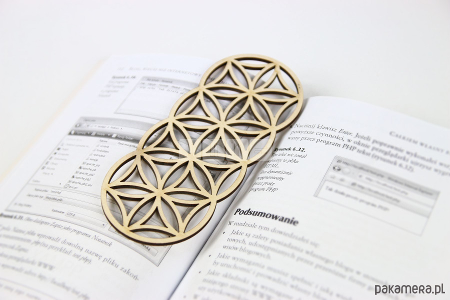 Zakładka do książki z ażurowym wzorem geometrycznym tzw kwiatu życia, idealna na prezent, niezwykle elegancka i trwała, wycięta została ze sklejki 3 mm oraz oszlifowana. Wielkość ok6x14,5cm