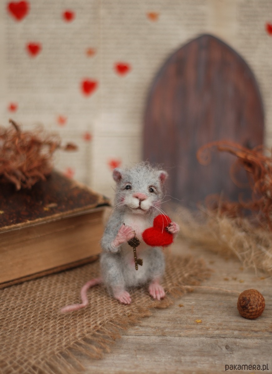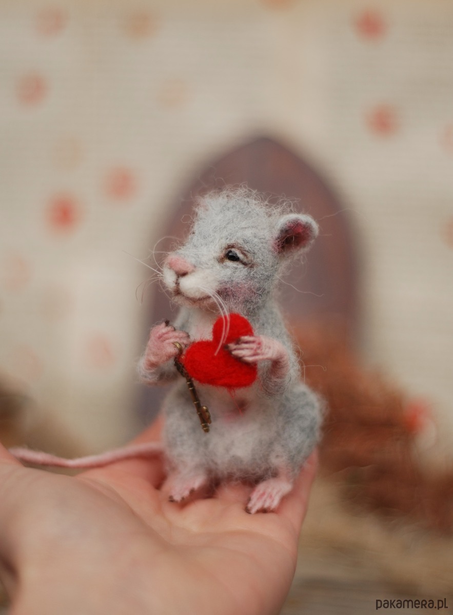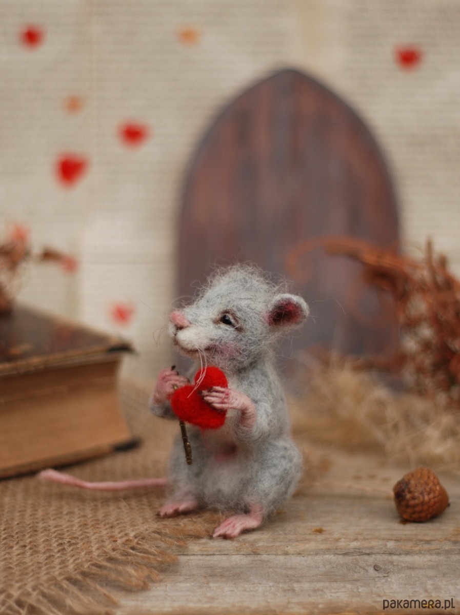 Myszka wykonana metodą filcowania na sucho z wełny merynos.