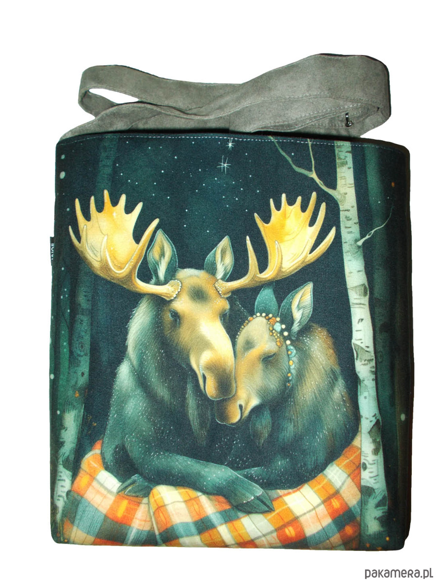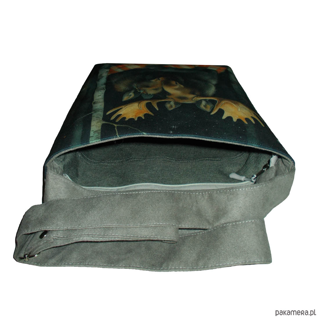 Autorska torba z usztywnionego eko zamszu, zapinana na zamek. Przód z weluru tapicerskiego. Pasek regulowany. Tył w kolorze paska (szary). Torba trzyma fason. Wewnątrz dwie kieszenie - jedna na zamek, druga z miejscem na telefon i coś jeszcze. W szwach wypustka. Denko poszerzone. szerokość 32cm wysokość 30cm plus denko 8cm