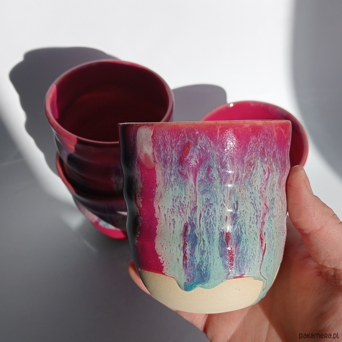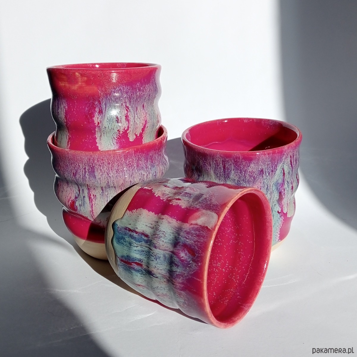 Intensywne, kolorowe, zakręcone czarki o pojemnościach od 300 do ok. 350 ml.
