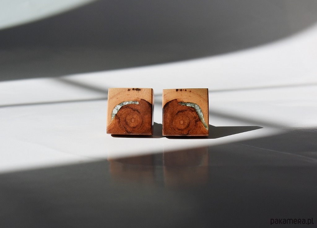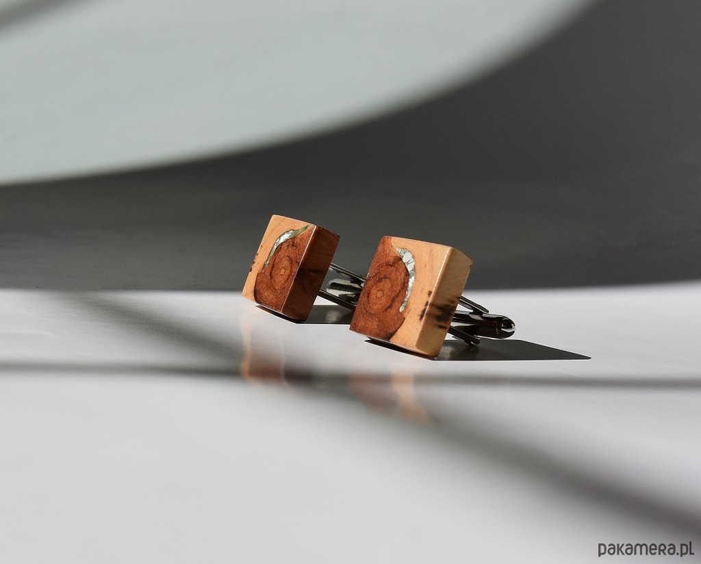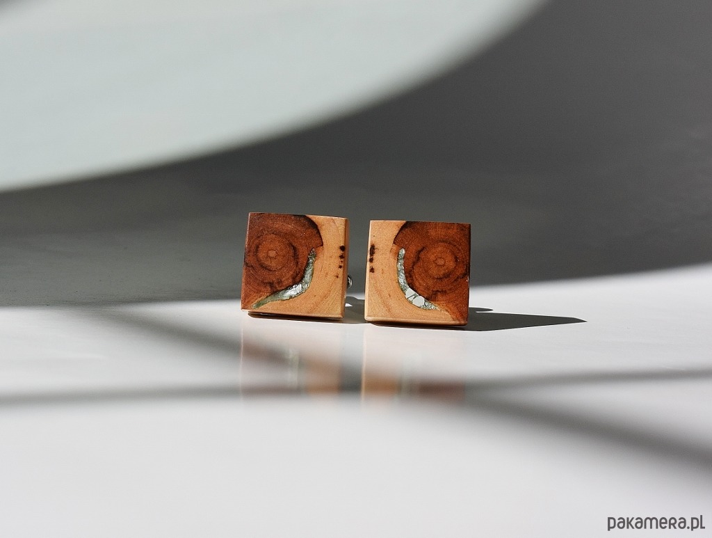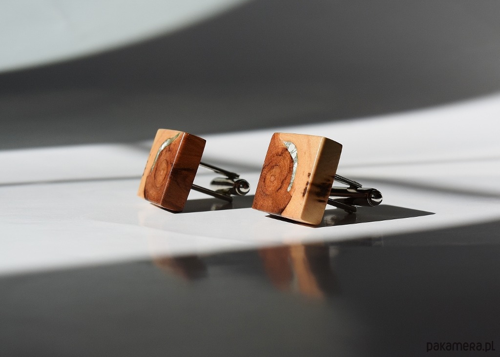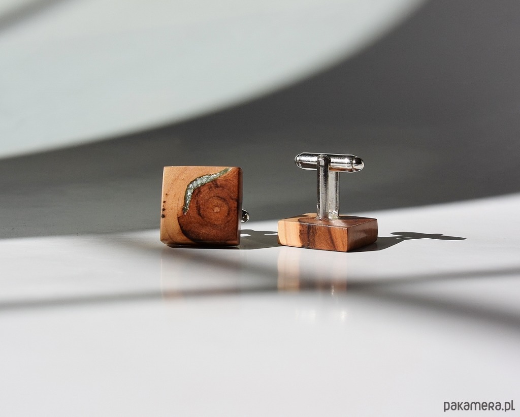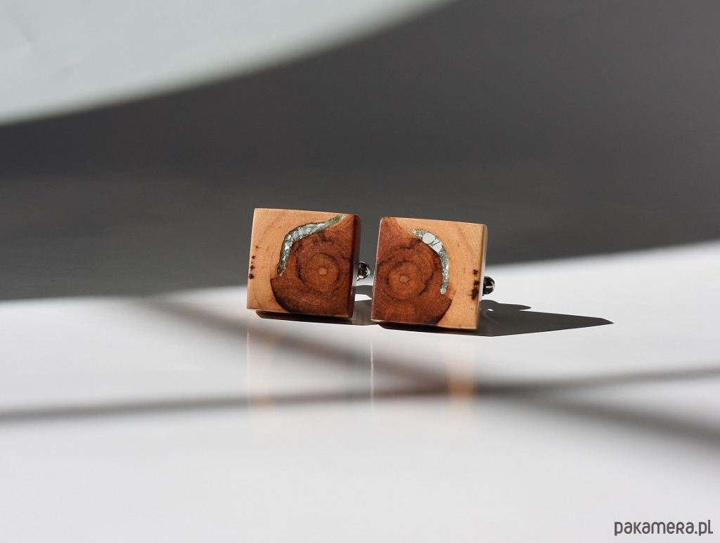 Spinki do mankietów o klasycznym kształcie zrobione zostały z drewna gruszy oraz inkrustacji z serafinitu. Zabezpieczone naturalnymi woskami i wypolerowane, dzięki czemu są gładkie i aksamitne w dotyku. Rysunek namalowany przez przyrodę oraz umieszczona inkrustacja sprawiły, że są niepowtarzalne.