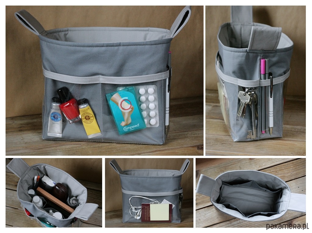 Organizer do torebki pomoże uporządkować wszystko co w niej jest luzem :). Różne rodzaje kieszonek do których można włożyć kosmetyki, leki, klucze, telefon, długopisy, a na środku miejsce na notes, portfel, wodę itp. Zewnętrzne kieszonki są z przeźroczystej folii. Z folii również jest dno, a więc jest łatwy do czyszczenia. W środku posiada 4 większe kieszonki ( z zaszewkami zwiększającymi miejsce) i 4 wąskie np. na klucze czy długopisy. Uszyty jest z bawełny, folii, a w środku dodatkowo posiada sztywną ocieplinę, żeby lepiej trzymał kształt. Posiada uszy do łatwiejszego wyciągania z torebki.