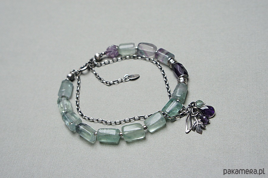 Bransoletka wykonana ze srebra [pr. 925] w połączeniu z fasetowanymi wałeczkami fluorytu [9-10mm], fasetowanym wałeczkiem ametystu [10mm] ,listkiem z ametystu [8mm] ,ametystem w okuciu ,fasetowanymi kuleczkami fluorytów [4mm]. Srebro oksydowane i przetarte. Całkowita długość bransoletki 19-20cm plus ozdobna przedłużka. Biżuteria ozdobnie zapakowana.