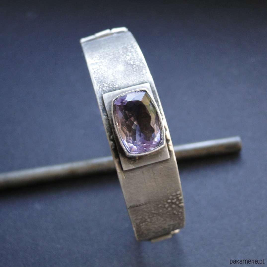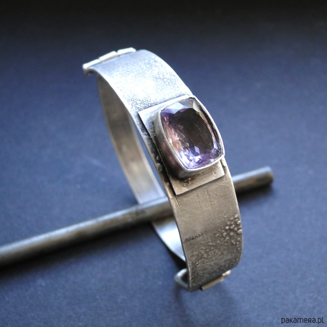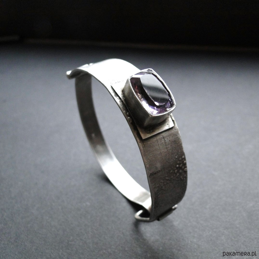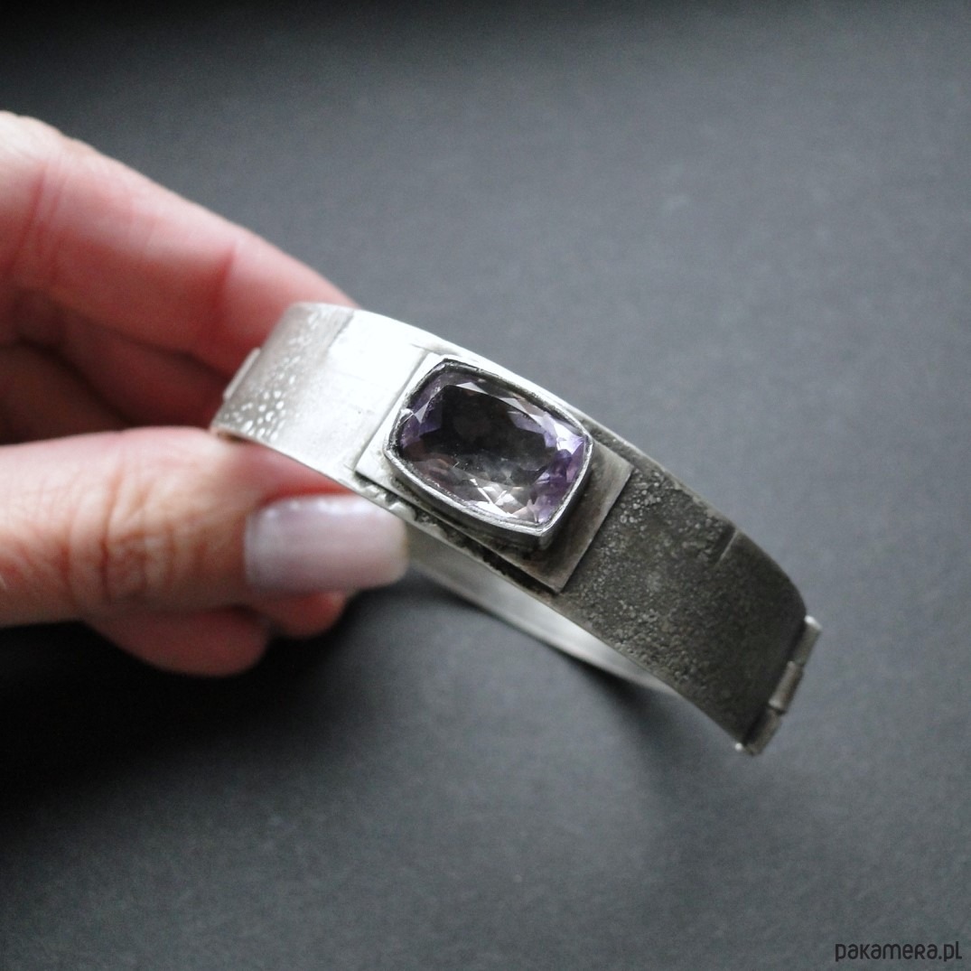 Masywna bransoleta wykonana na zamówienie w pojedynczym egzemplarzu. Srebro 930,oksydowane i szorowane. Surowa faktura. Bransoleta z przodu szersza-niecałe 1,5 cm,tył 9mm. Kamień: imponujacy ametryn wysokiej klasy o wym.14x10mm. Bransoleta zapinana na hak. Nie moczyć w wodzie. Waga branbsolety: 21,55g.