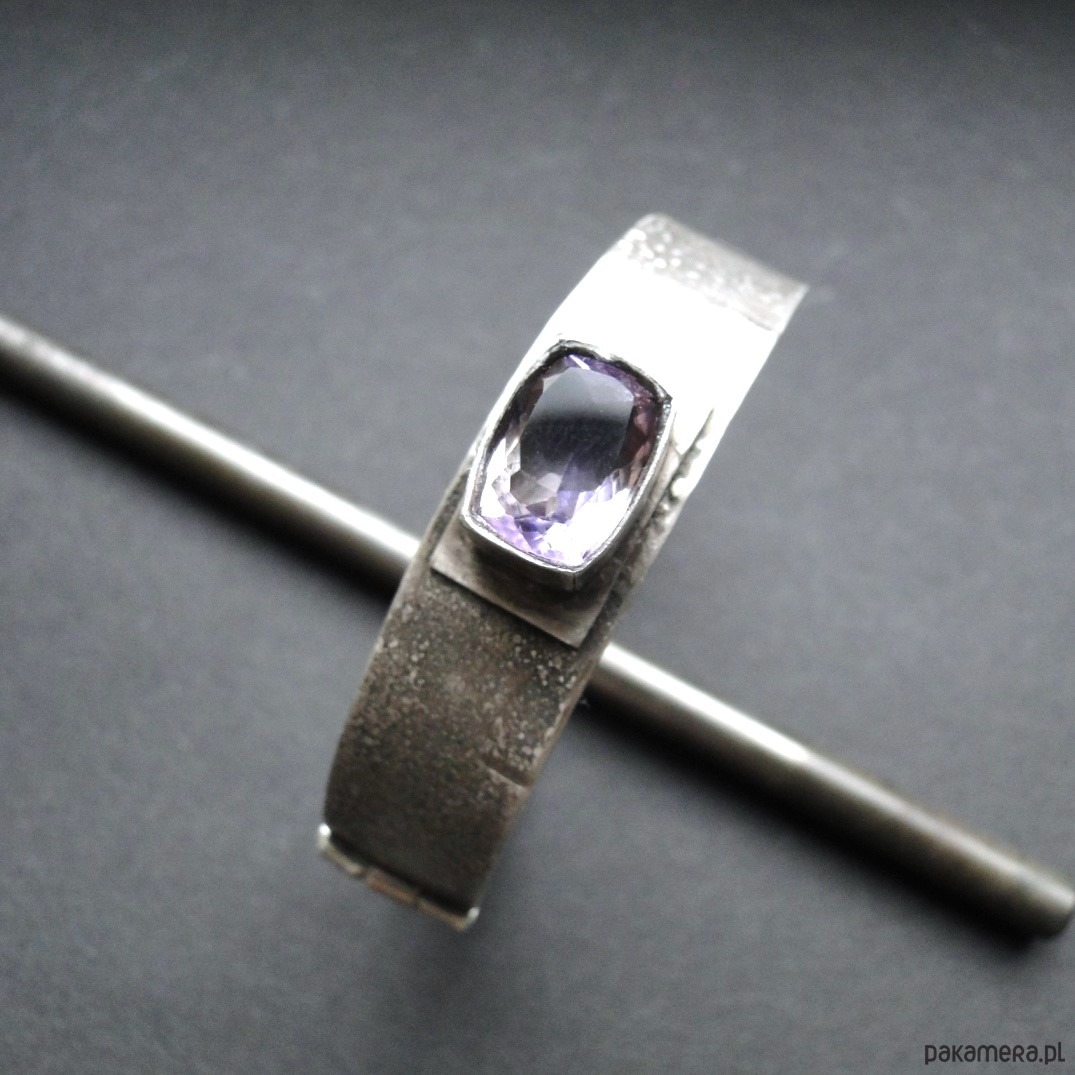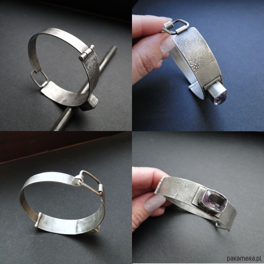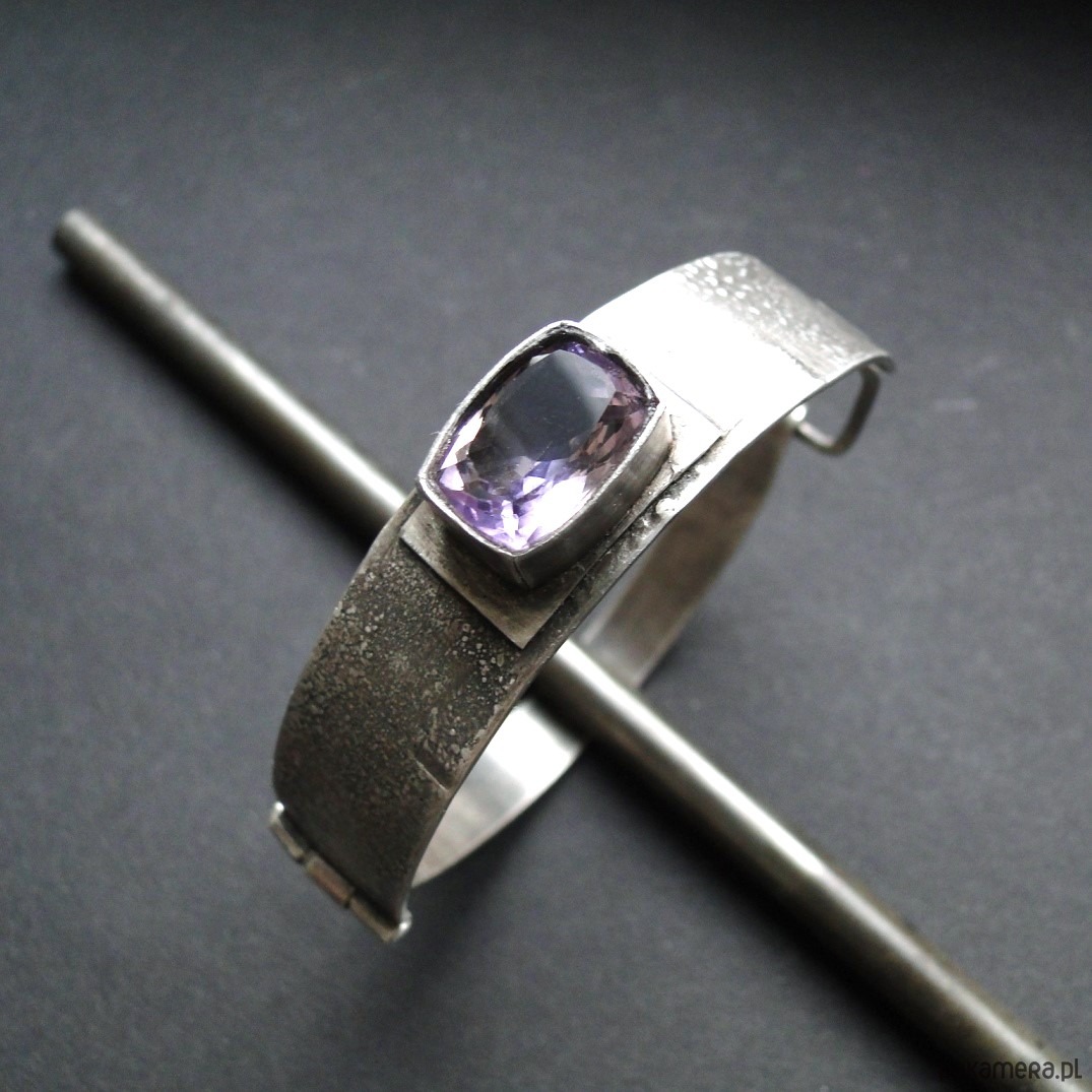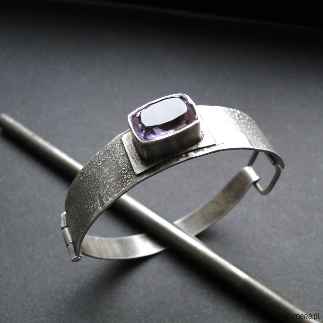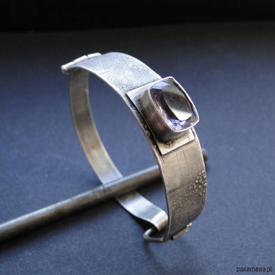 Masywna bransoleta wykonana na zamówienie w pojedynczym egzemplarzu. Srebro 930,oksydowane i szorowane. Surowa faktura. Bransoleta z przodu szersza-niecałe 1,5 cm,tył 9mm. Kamień: imponujacy ametryn wysokiej klasy o wym.14x10mm. Bransoleta zapinana na hak. Nie moczyć w wodzie. Waga branbsolety: 21,55g.