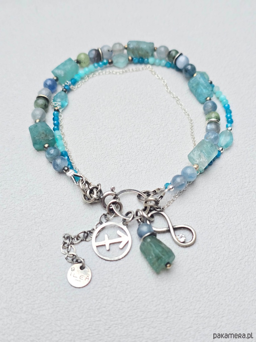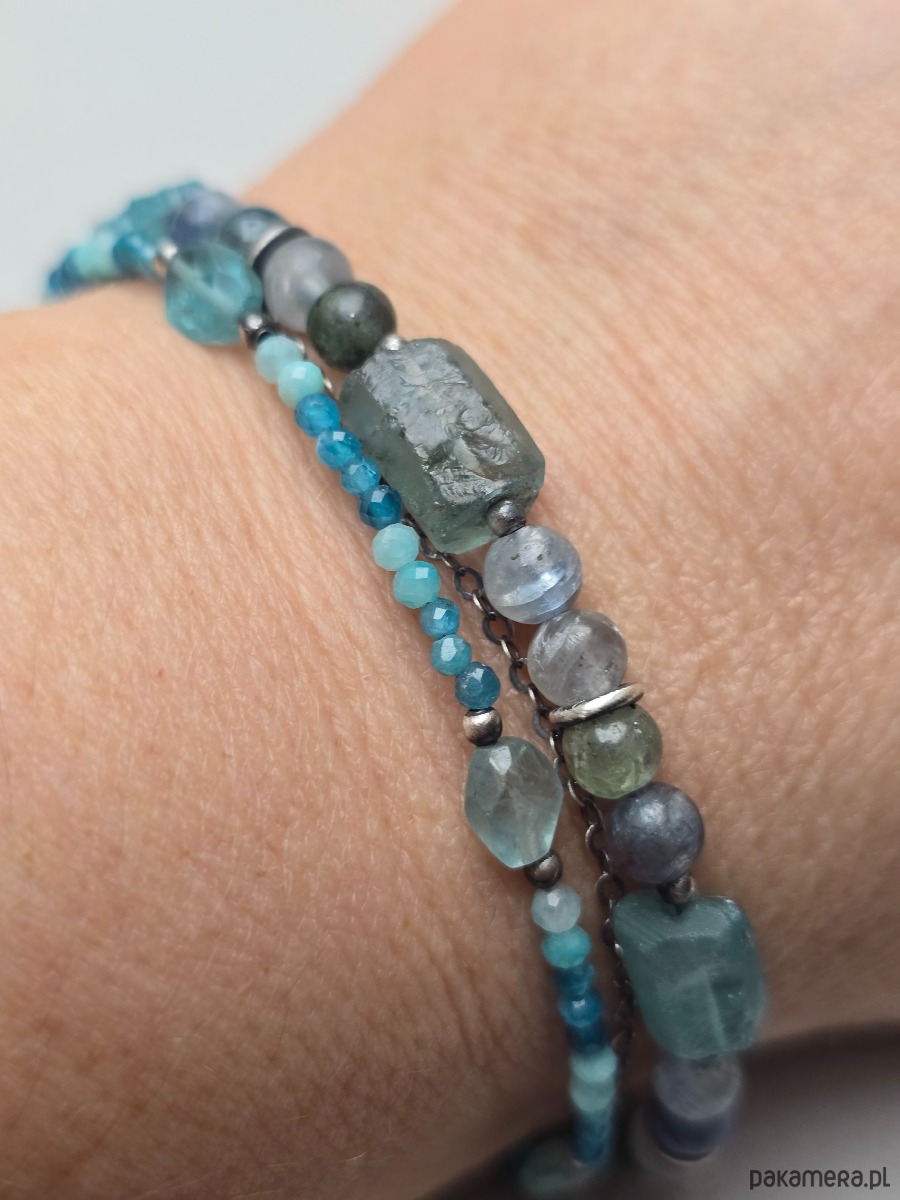 Potrójna bransoletka wykonana z apatytów, kyanitów i amazonitów w przedziale wielkości od 2,5 do 7mm