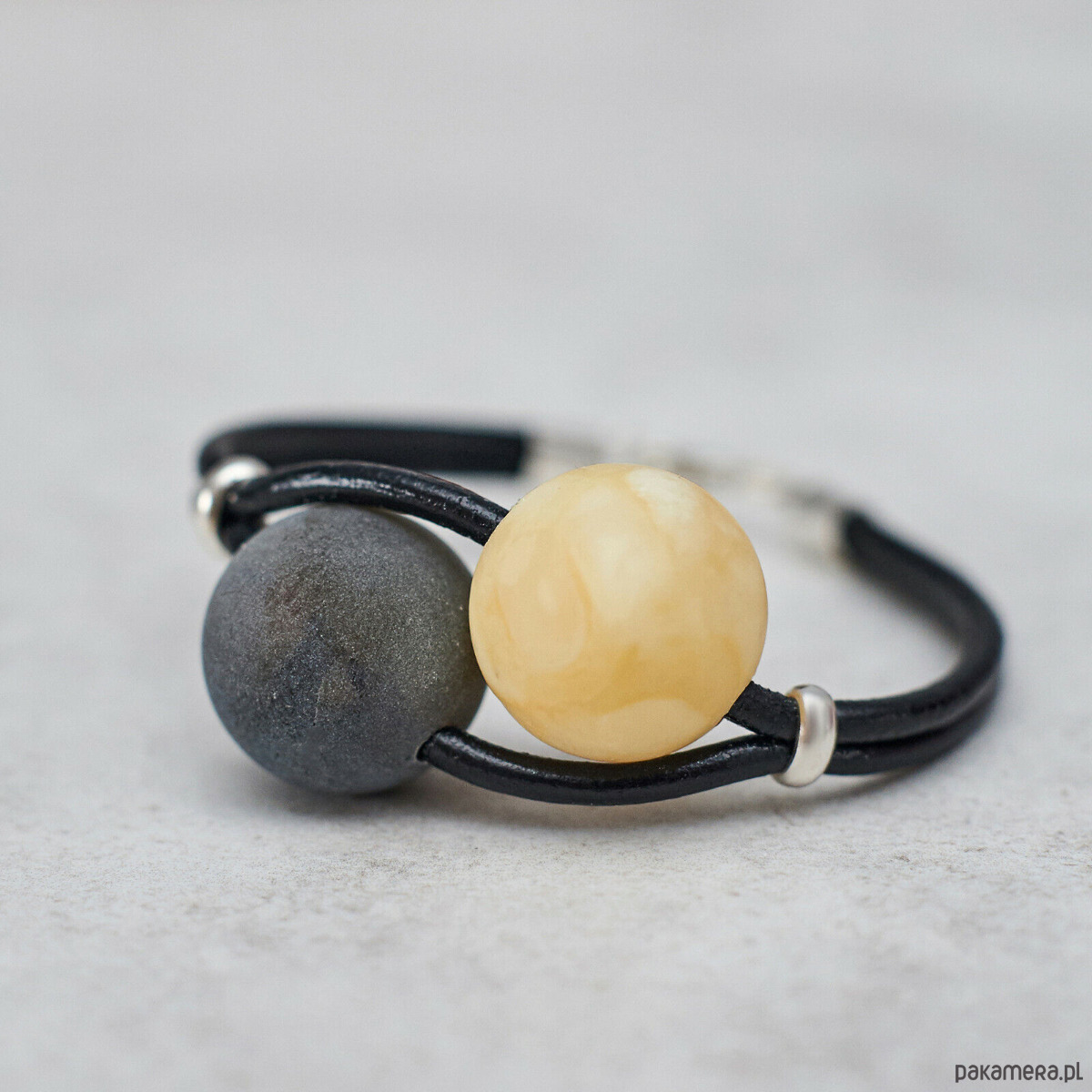 Materiały: bursztyn bałtycki, srebro próby 925, skórzany rzemień