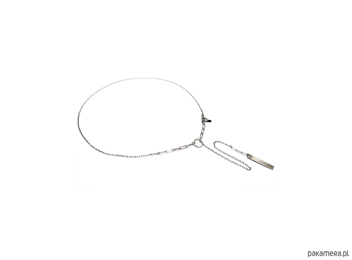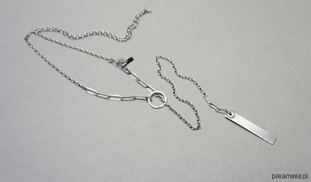 Naszyjnik wykonany ze srebra [pr. 925]. Naszyjnik przekładany przez kółeczko. Srebro oksydowane i przetarte. Całkowita długość łańcuszka 79cm. Biżuteria ozdobnie zapakowana.