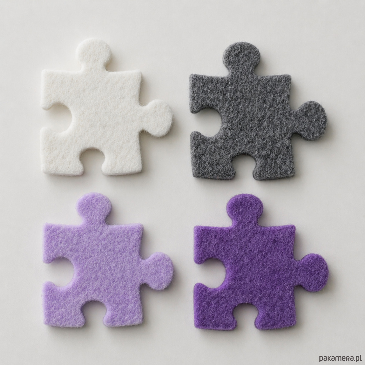 Cztery filcowe broszki wykonane na zamówienie w starannie dobranej palecie kolorów: 1 (biały), 2 (szary), 5 (blady fiolet) oraz 6 (intensywniejszy fiolet). Każda z nich została wycięta z wysokiej jakości filcu o grubości ok. 4 mm, dzięki czemu jest przyjemnie sztywna, trwała i dobrze trzyma formę. Broszki wyposażone są w klasyczne zapięcie typu agrafka, co zapewnia wygodę noszenia i łatwe przypięcie do swetra, płaszcza, torby czy szalika.