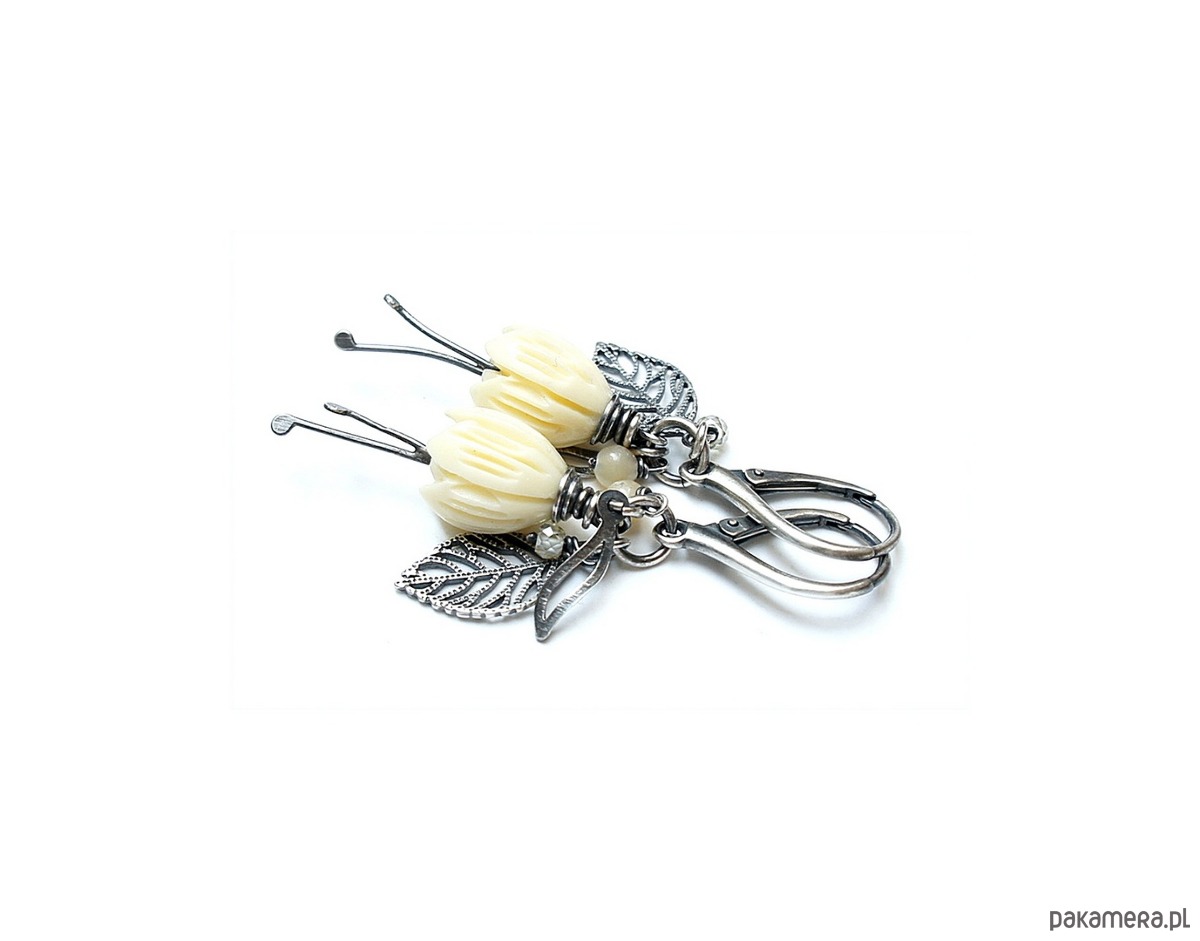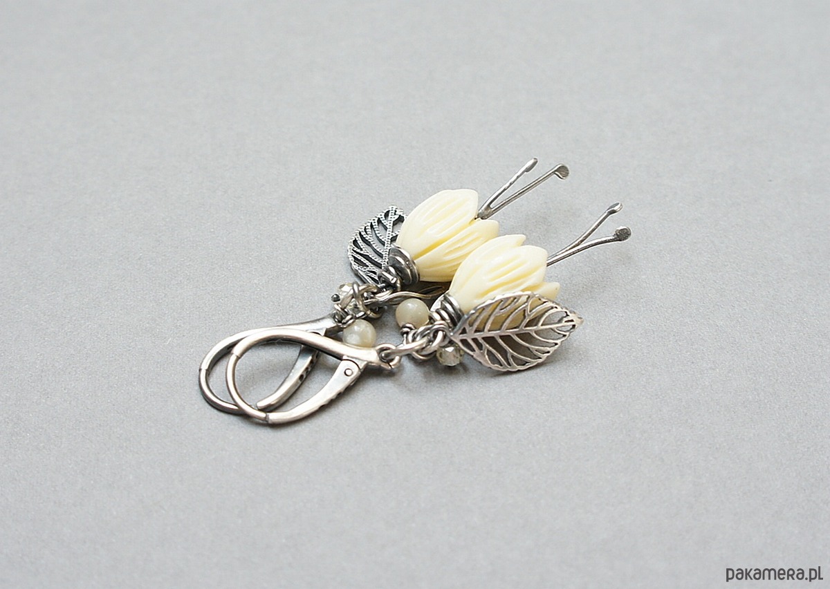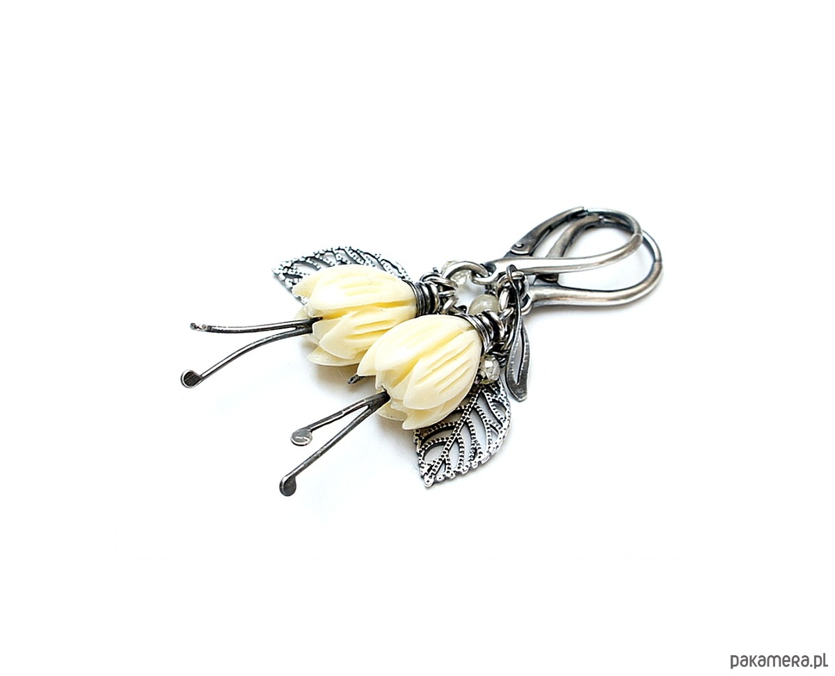 Kolczyki wykonane ze srebra [pr.925] w połączeniu z kielichami kwiatów z korala [11mm], cyrkoniami [3mm], kuleczkami muszli [4mm] oraz srebrnymi listkami. Całość oksydowana i przetarta. Całkowita długość kolczyków 5,4cm. Biżuteria ozdobnie zapakowana