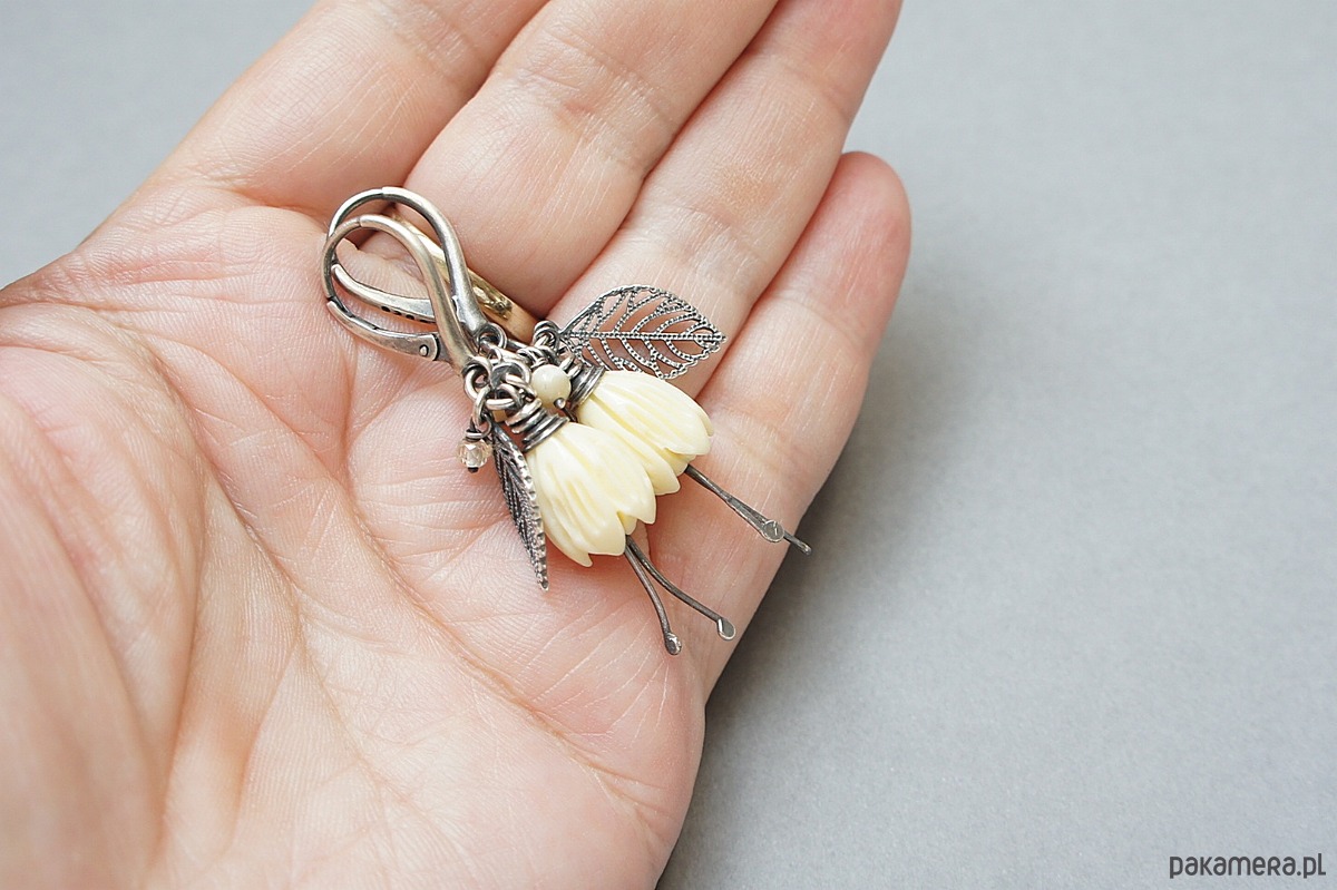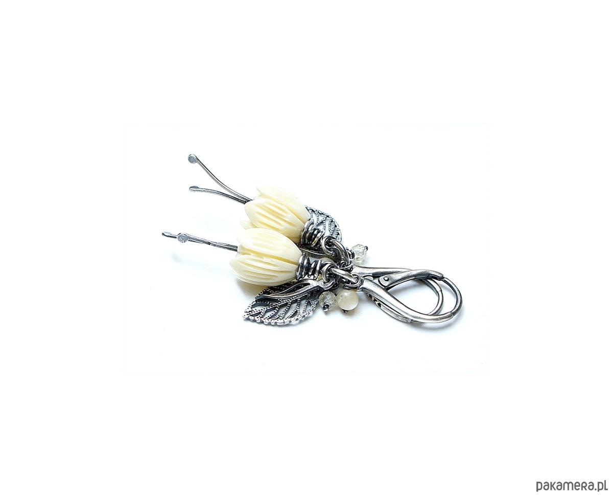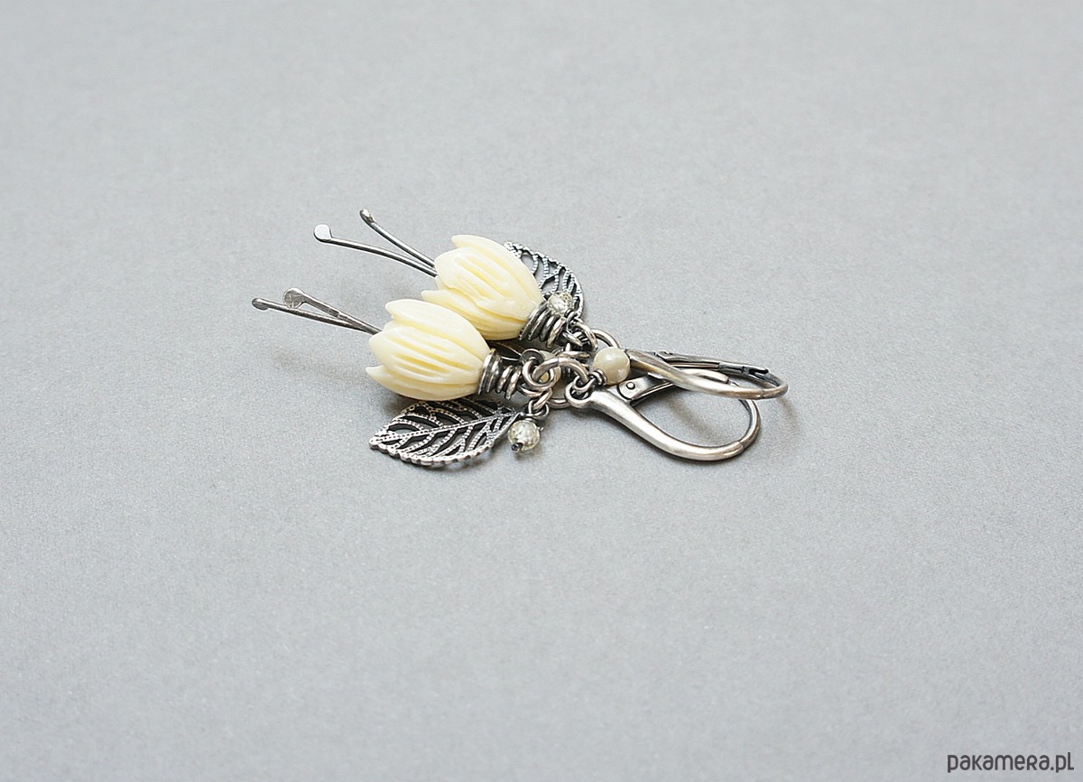 Kolczyki wykonane ze srebra [pr.925] w połączeniu z kielichami kwiatów z korala [11mm], cyrkoniami [3mm], kuleczkami muszli [4mm] oraz srebrnymi listkami. Całość oksydowana i przetarta. Całkowita długość kolczyków 5,4cm. Biżuteria ozdobnie zapakowana