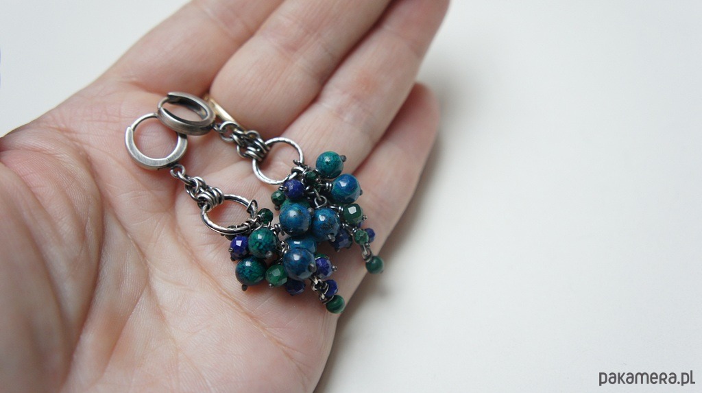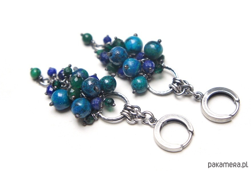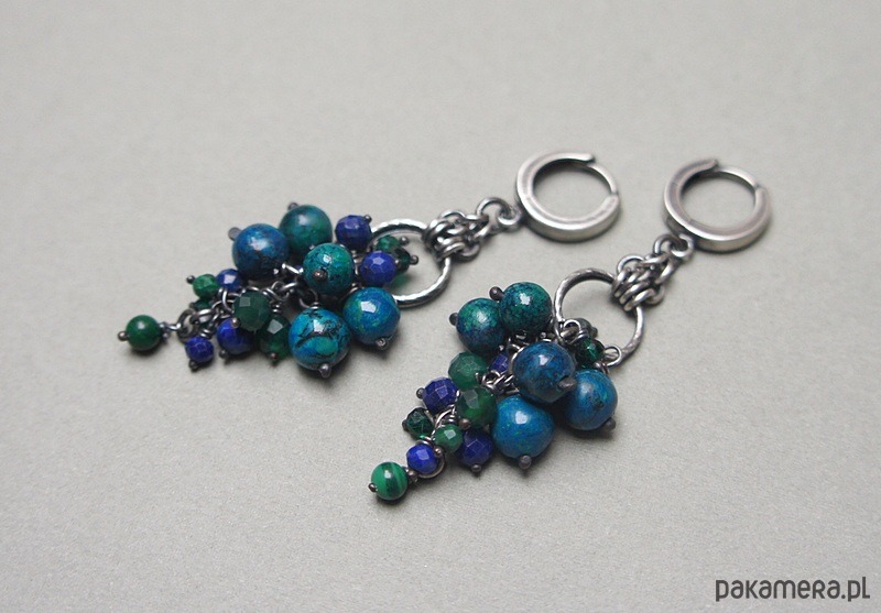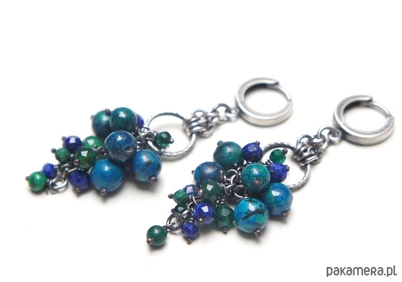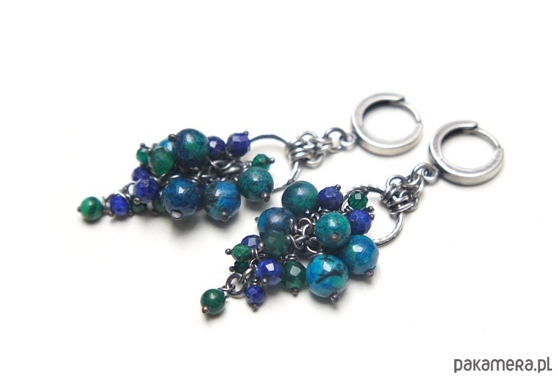 Kolczyki wykonane ze srebra [pr. 925] w połączeniu z kuleczkami chryzokoli [6mm], zielonych onyksów [4mm], fasetowanych lapisów lazuli [4mm i 3mm], malachitów [4mm i 3mm], szmaragdów [3mm - klarowane]. Całość oksydowana i przetarta. Całkowita długość kolczyków 6,2cm. Biżuteria ozdobnie zapakowana.