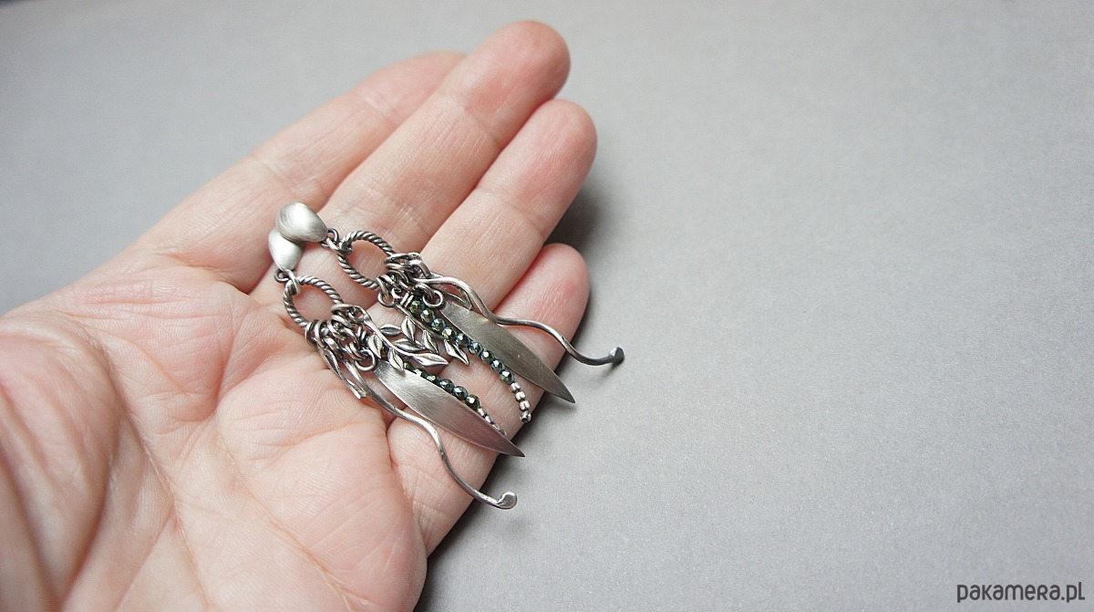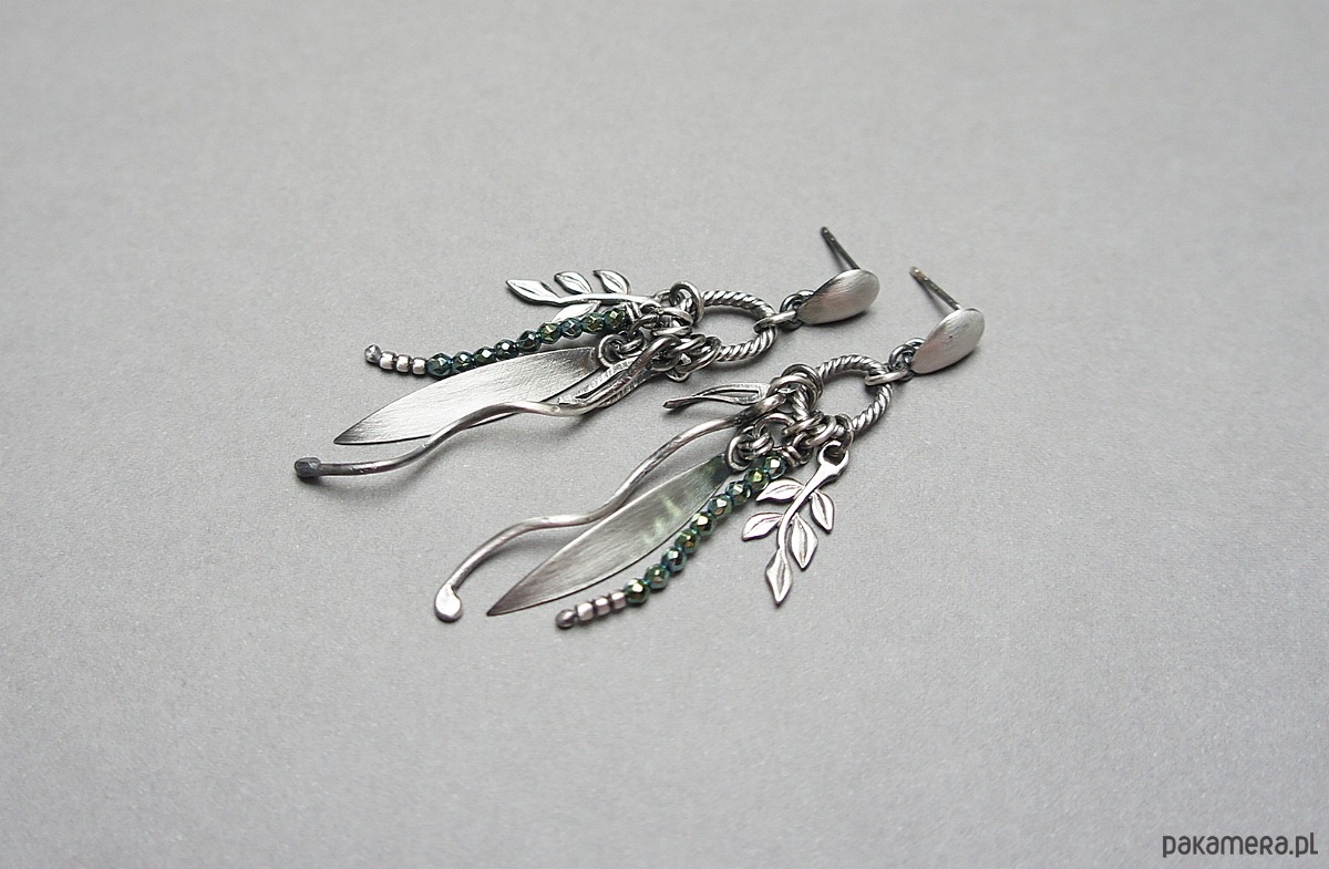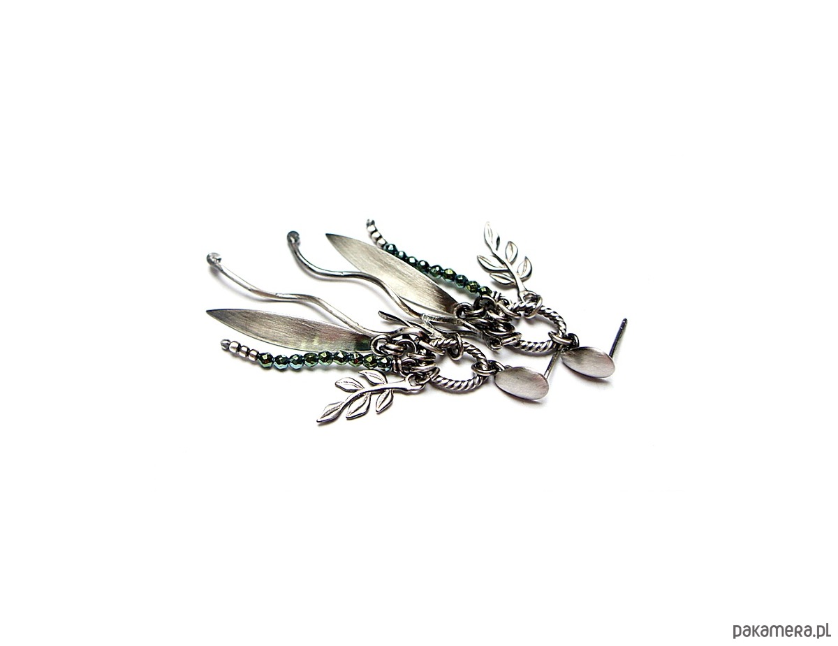 Kolczyki wykonane ze srebra [pr. 925] w połączeniu z kuleczkami zielonych hematytów [2mm] oraz srebrnymi przywieszkami. Całość oksydowana i przetarta. Całkowita długość kolczyków ok. 6cm. Biżuteria ozdobnie zapakowana