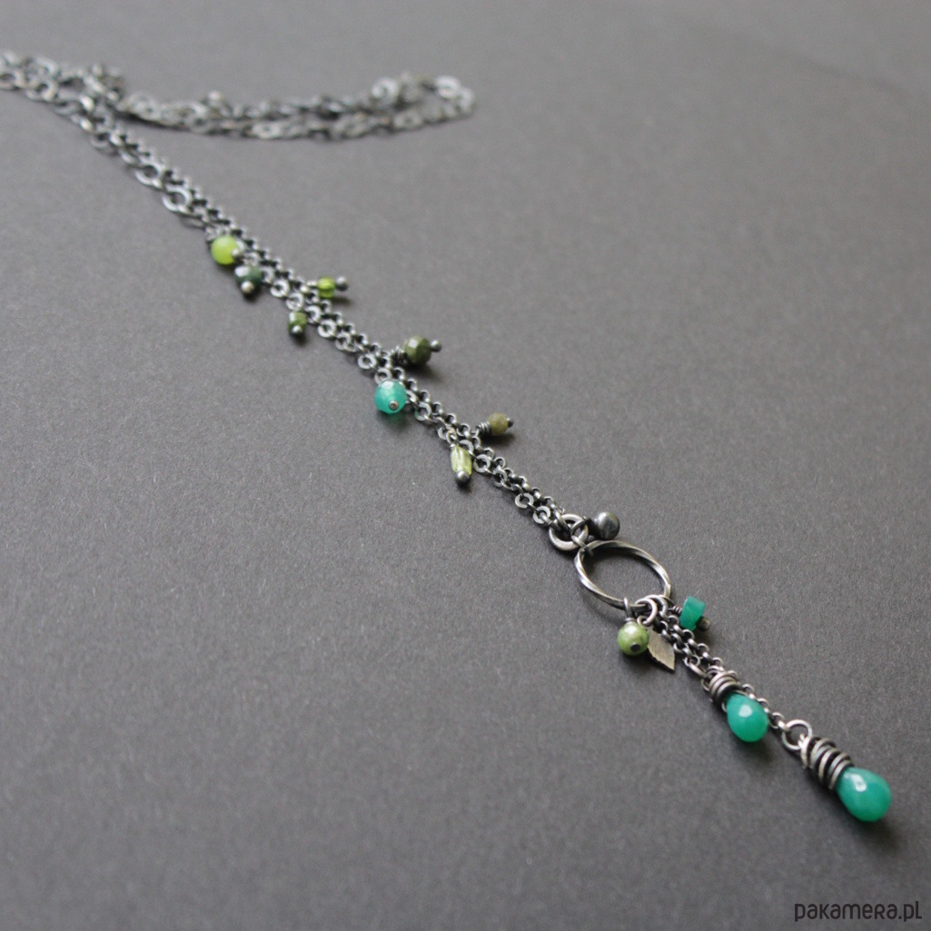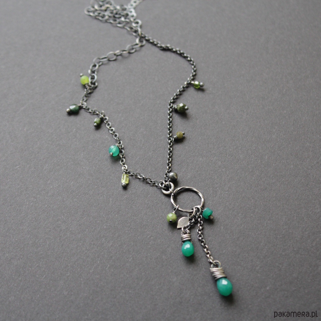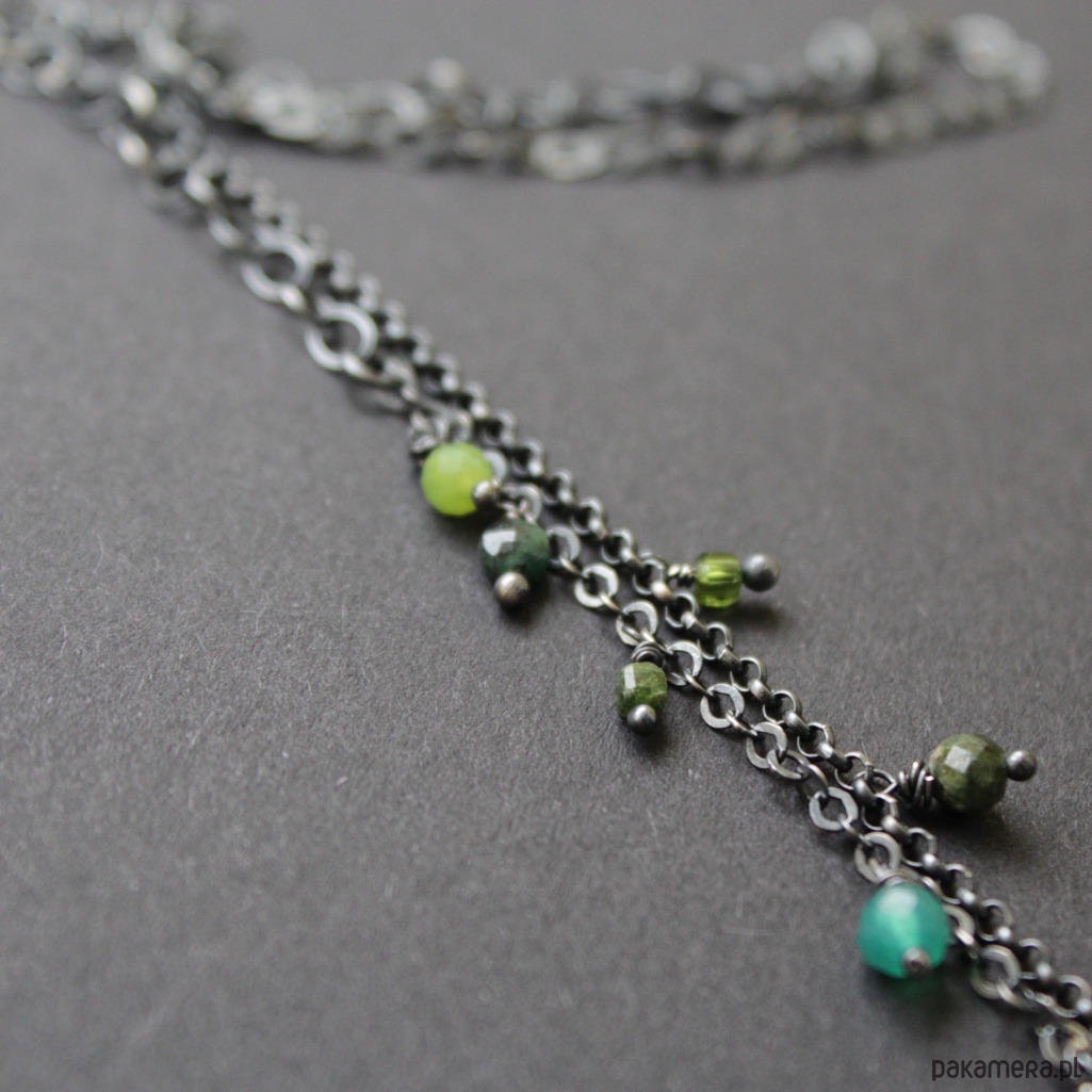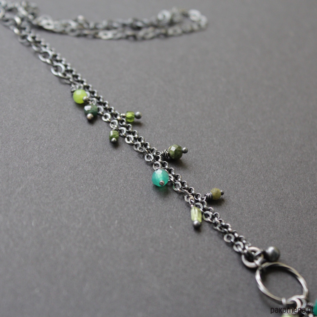 Na srebrnym łańcuchu rozrzucone zostały kolorowe przepiękne zielone turmaliny, szmaragd, zielone onyksy oraz oliwiny.