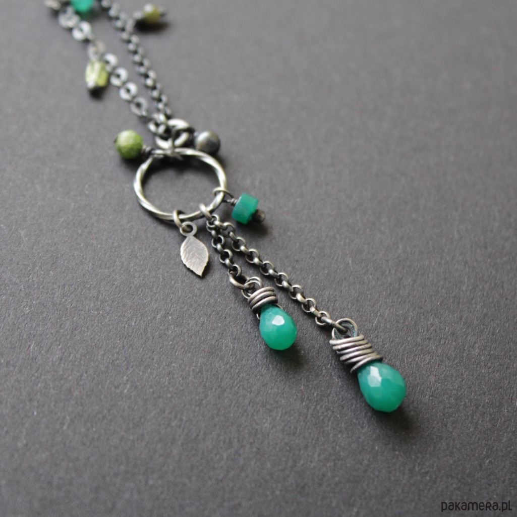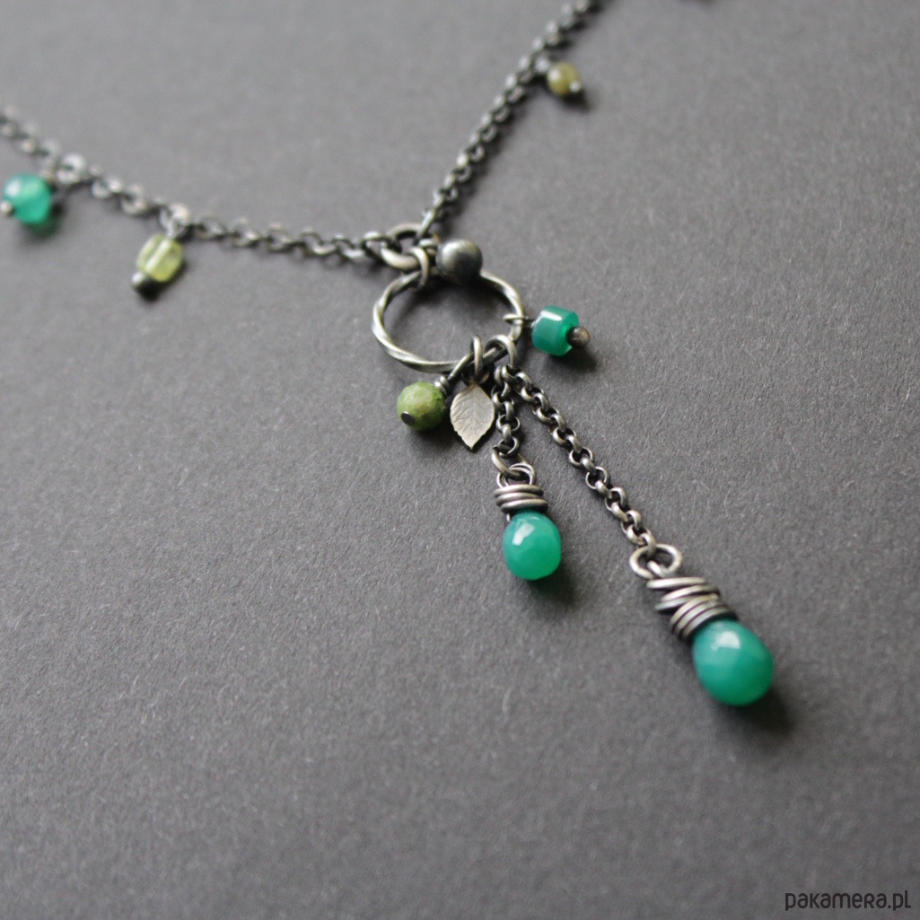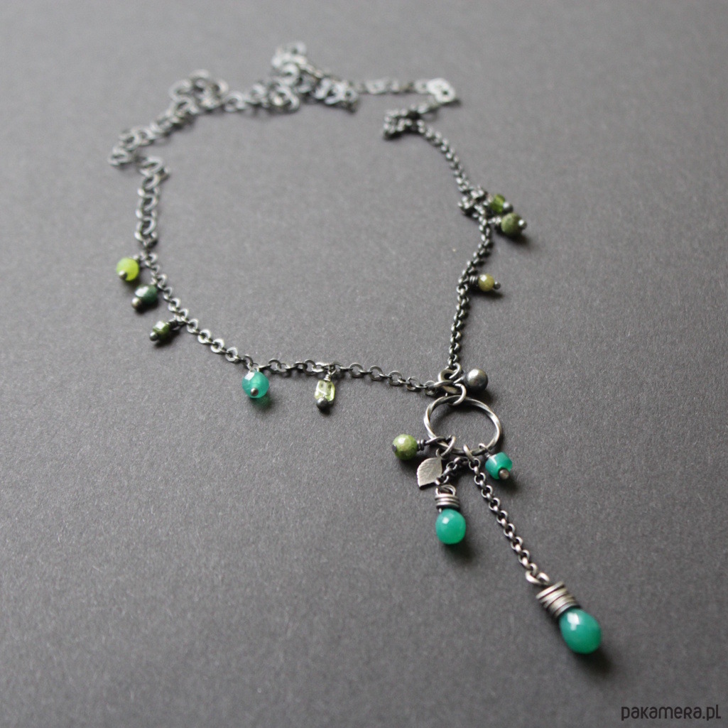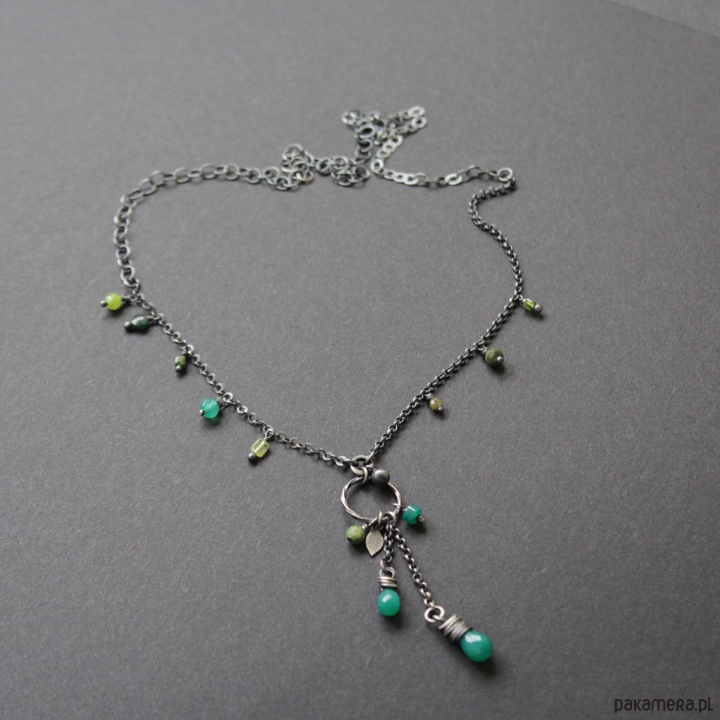 Na srebrnym łańcuchu rozrzucone zostały kolorowe przepiękne zielone turmaliny, szmaragd, zielone onyksy oraz oliwiny.