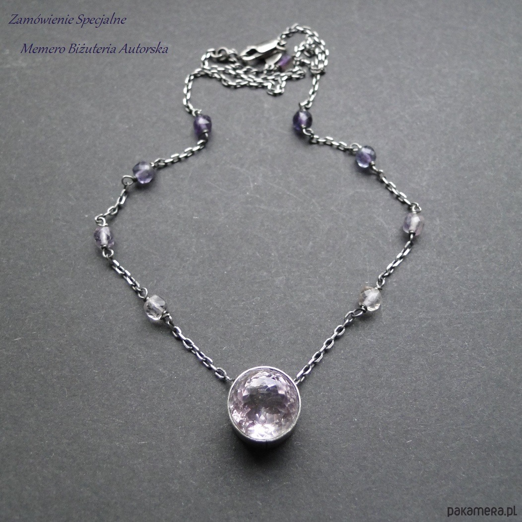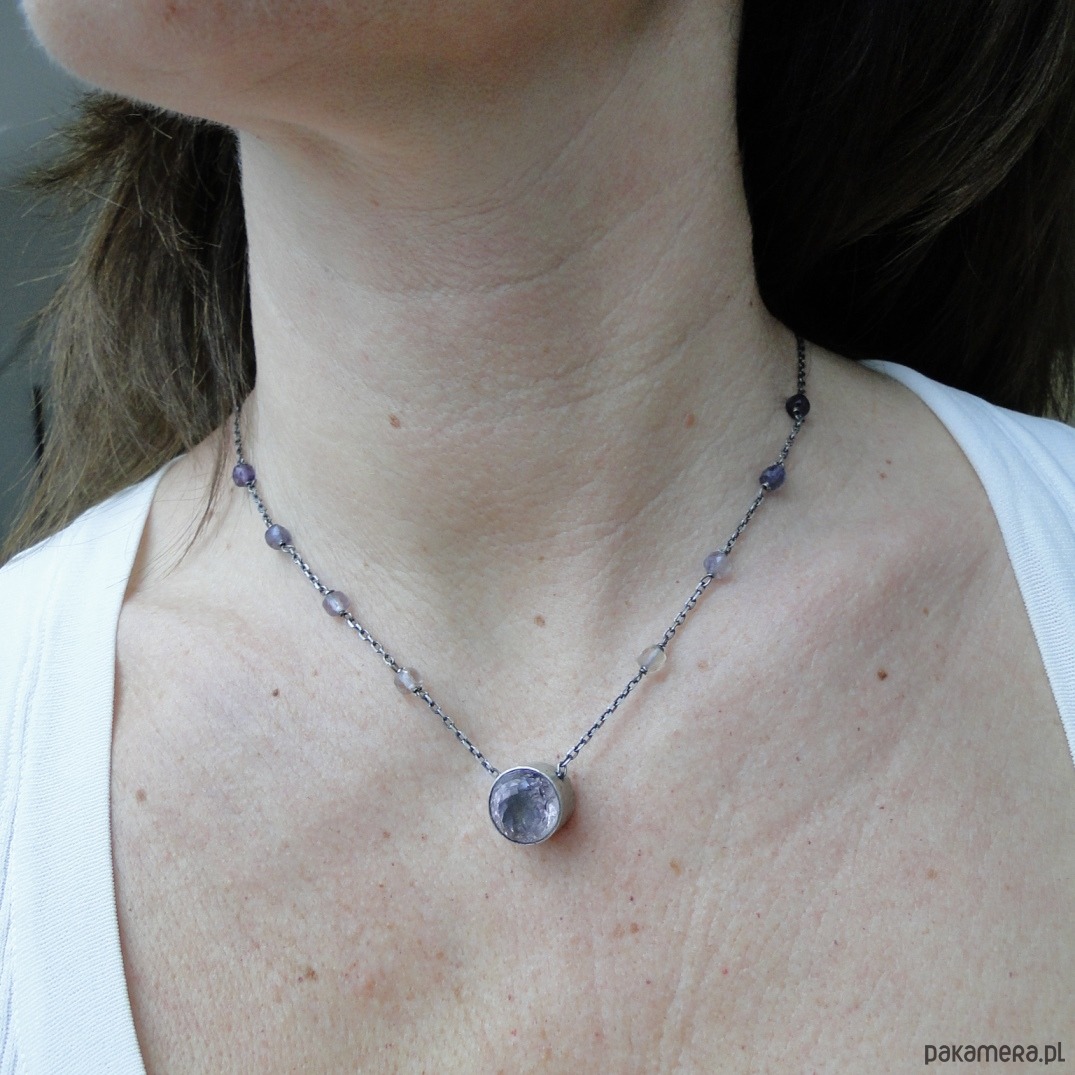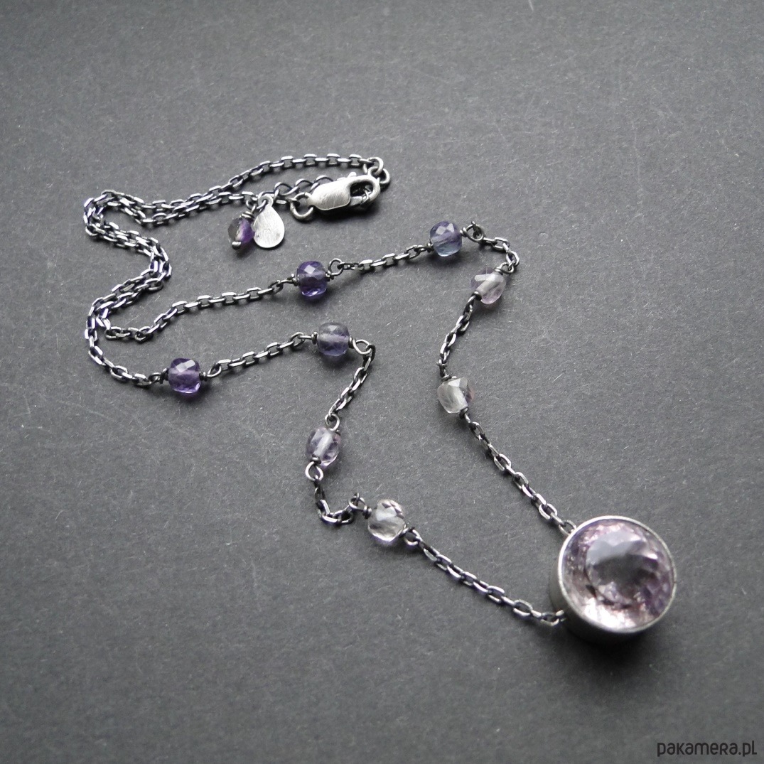 Ciekawy,dość delikatny naszyjnik wykonany na zamówienie. Srebro 925 ,oksydowane i szorowane; imponujący naturalny ametryn fi 13,5mm; fluoryty w gradacji kolorystycznej. Nie moczyć w wodzie. Obwód 42 cm plus 3 cm regulacji.