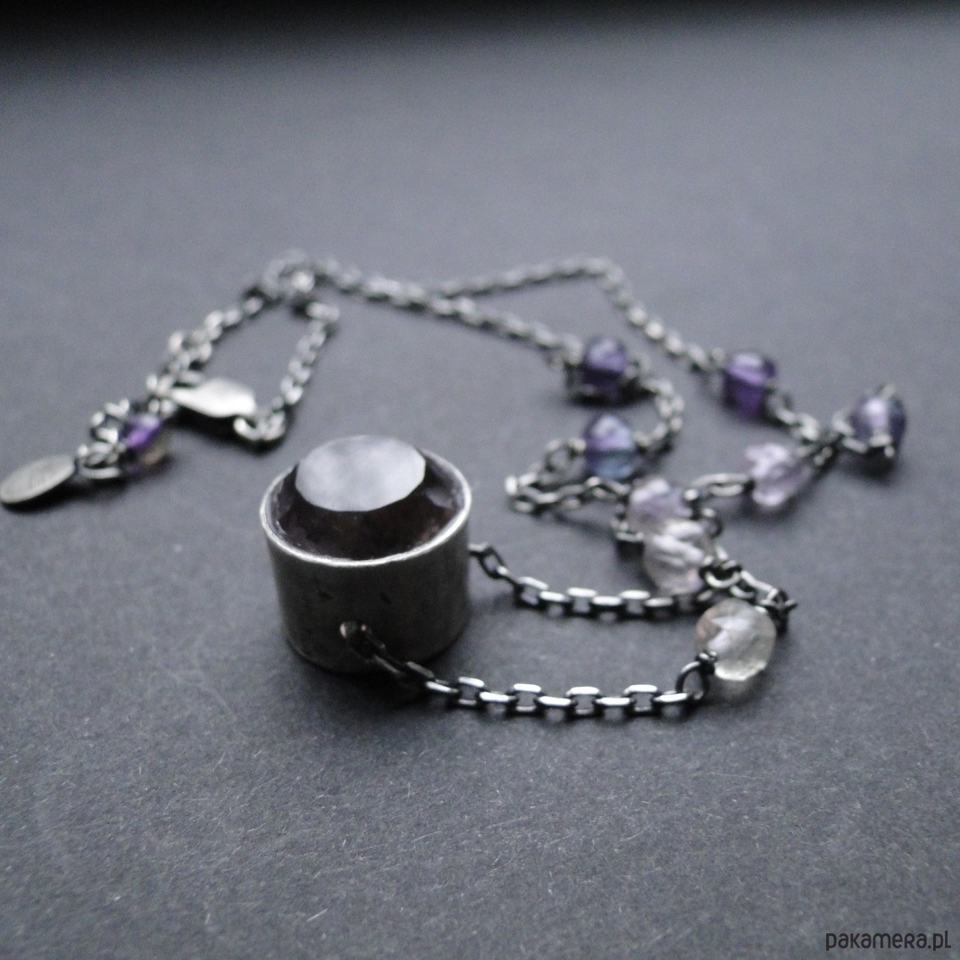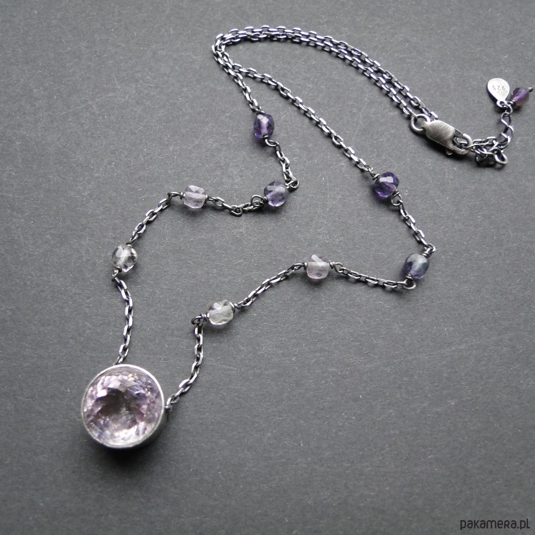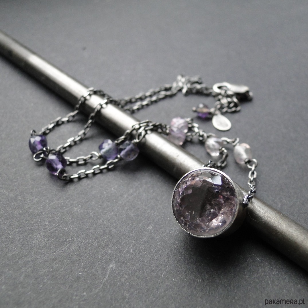 Ciekawy,dość delikatny naszyjnik wykonany na zamówienie. Srebro 925 ,oksydowane i szorowane; imponujący naturalny ametryn fi 13,5mm; fluoryty w gradacji kolorystycznej. Nie moczyć w wodzie. Obwód 42 cm plus 3 cm regulacji.