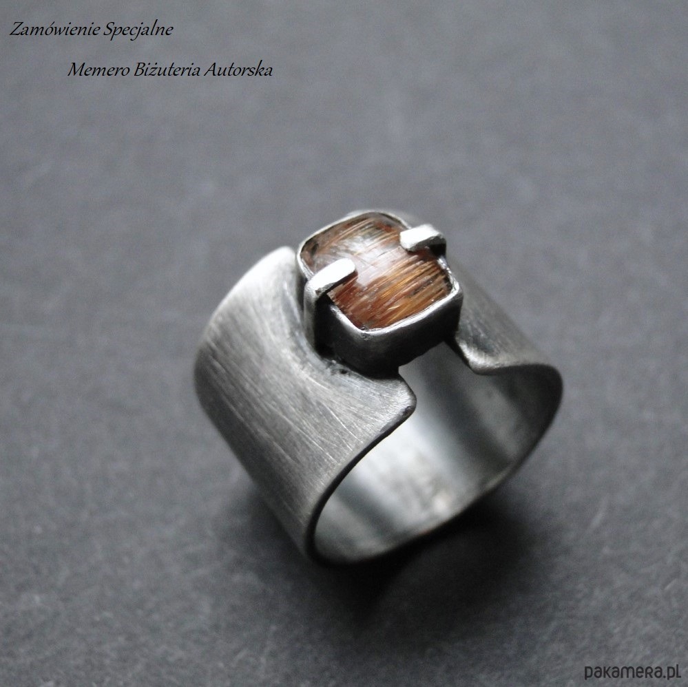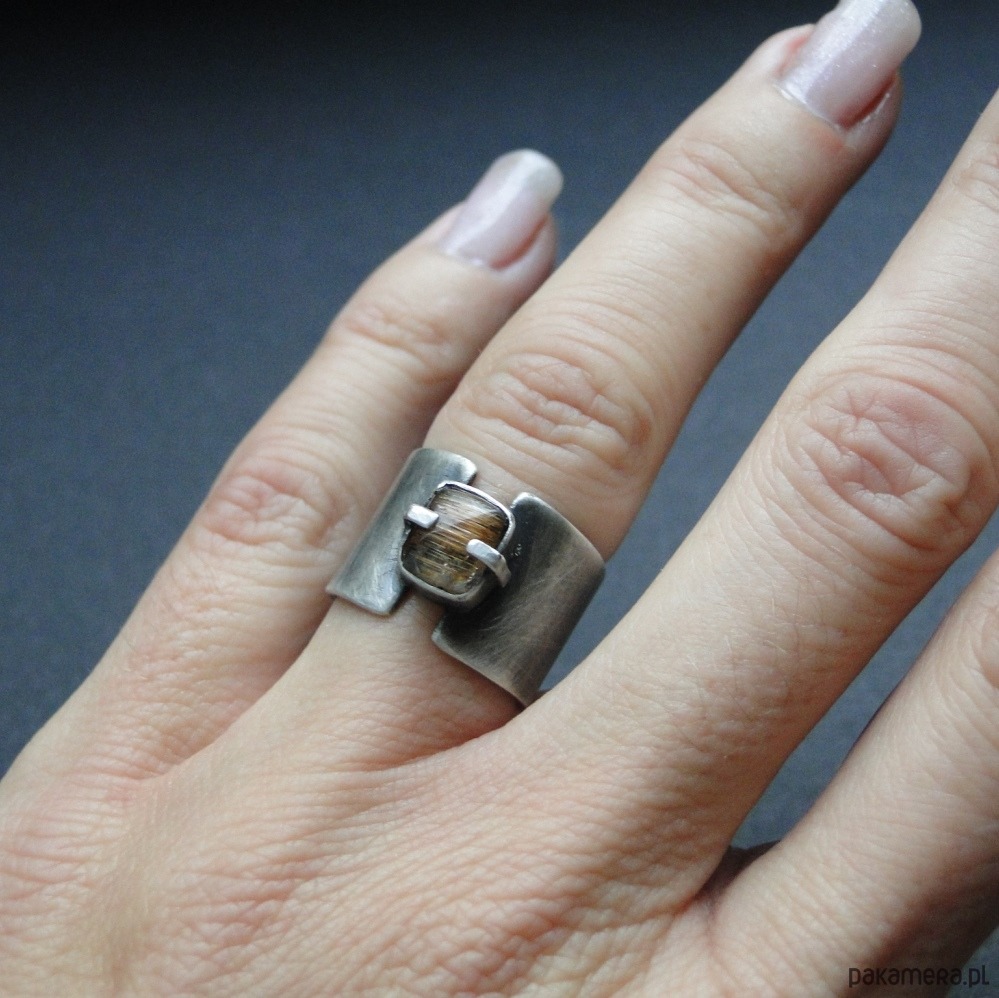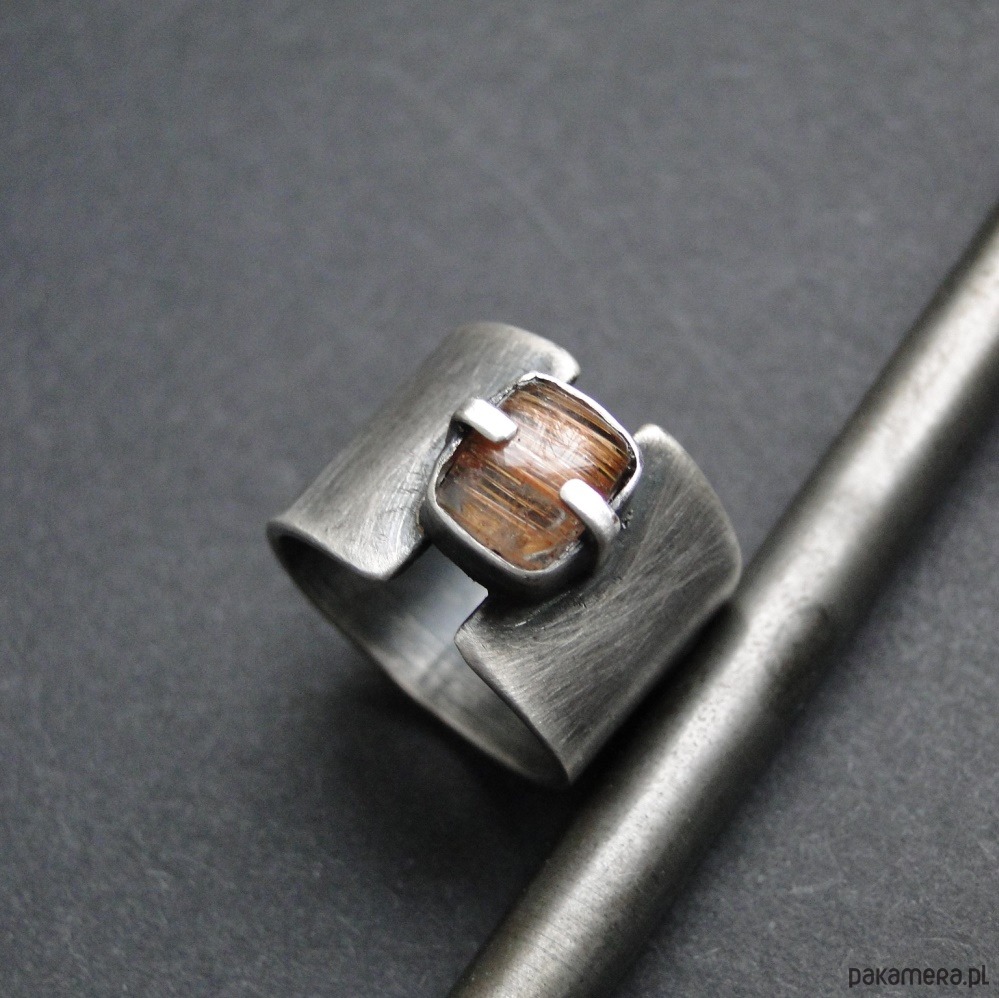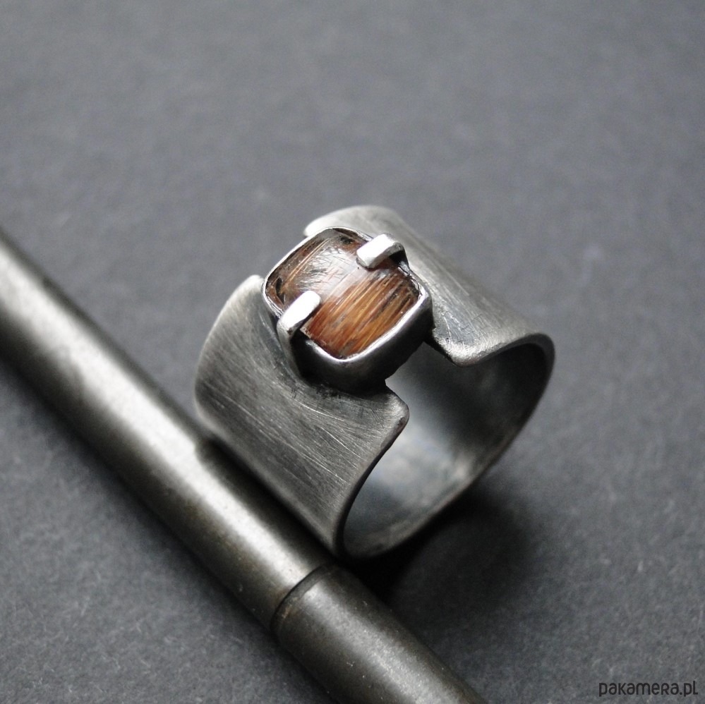 Surowy pierścień wykonany na zamówienie. Srebro 925,oksydowane i szorowane. Kwarc rutylowy z pięknymi, rudymi wstawkami rutylu. Rozmiar wg ustaleń.