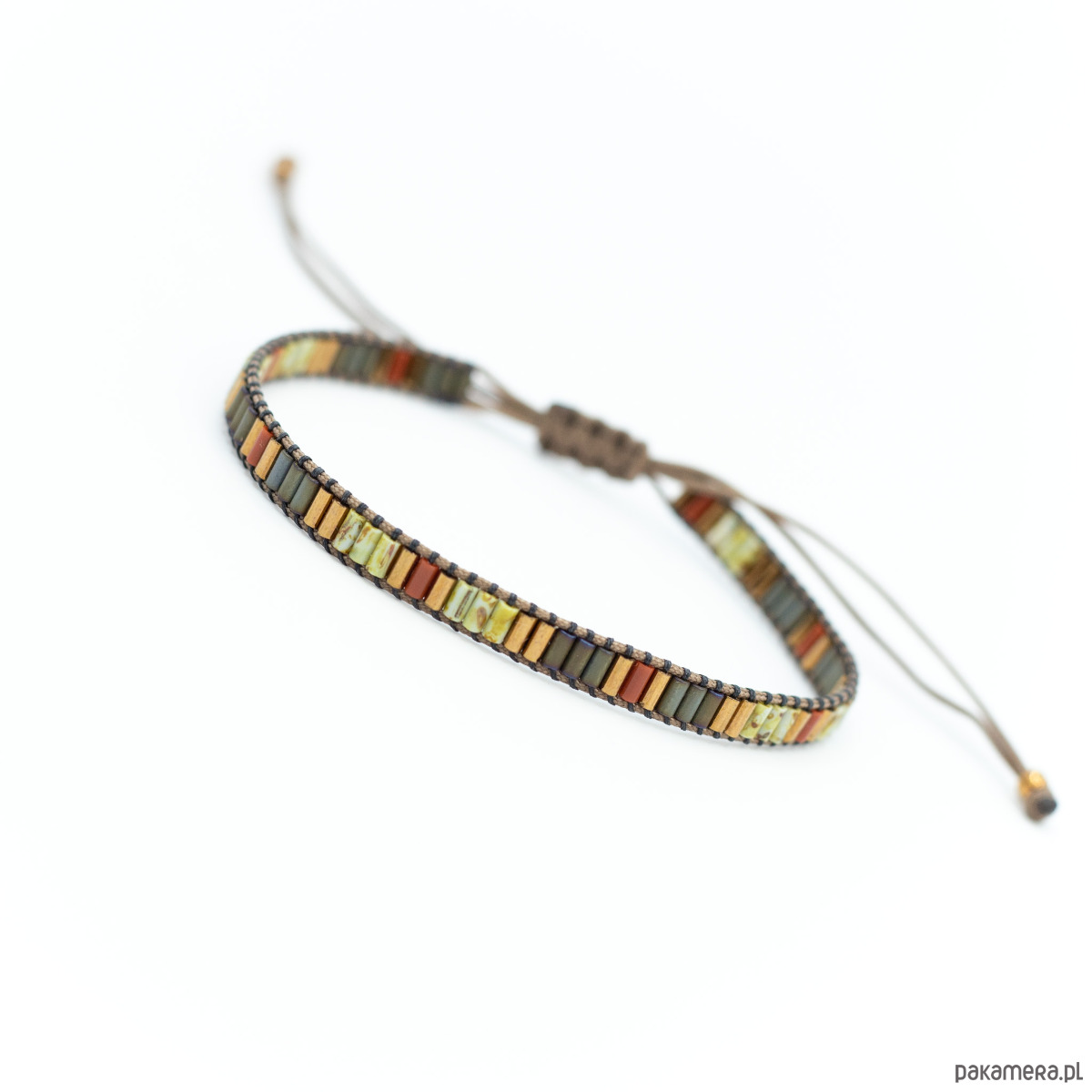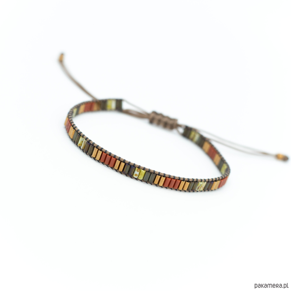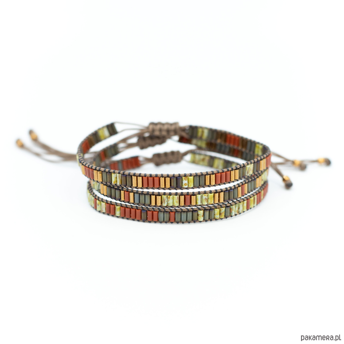 Zestaw pięciu bransoletek wykonanych z koralików szklanych Toho oraz nici i sznurka nylonowego. Kolory: oliwkowa zieleń, jasna zieleń, ceglasty, miedziany, złoty, srebrny, brązowy