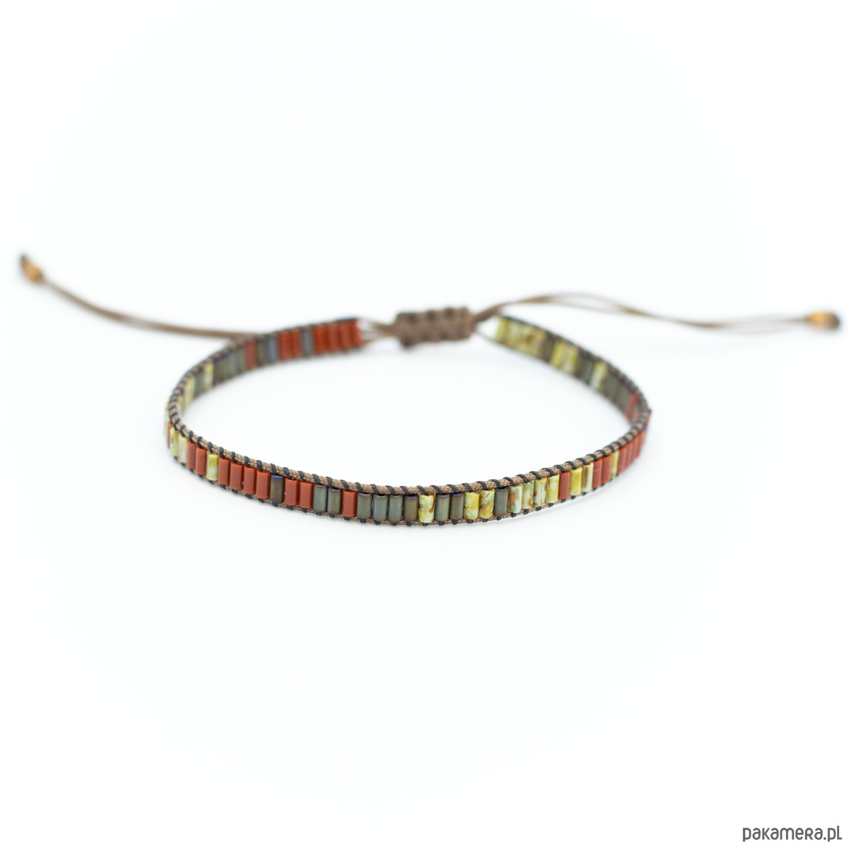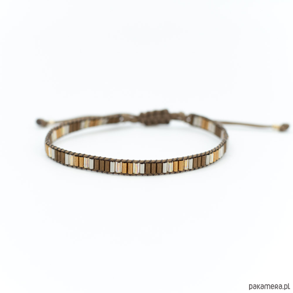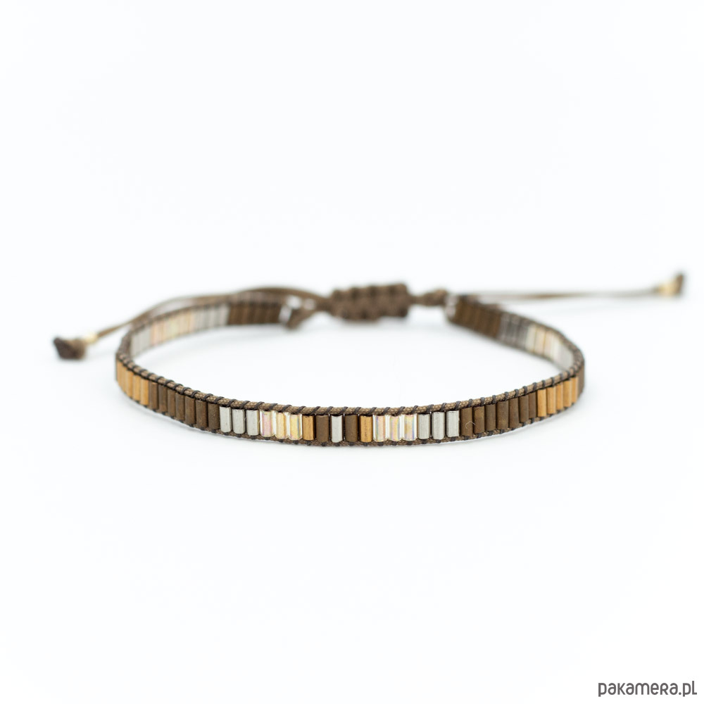 Zestaw pięciu bransoletek wykonanych z koralików szklanych Toho oraz nici i sznurka nylonowego. Kolory: oliwkowa zieleń, jasna zieleń, ceglasty, miedziany, złoty, srebrny, brązowy