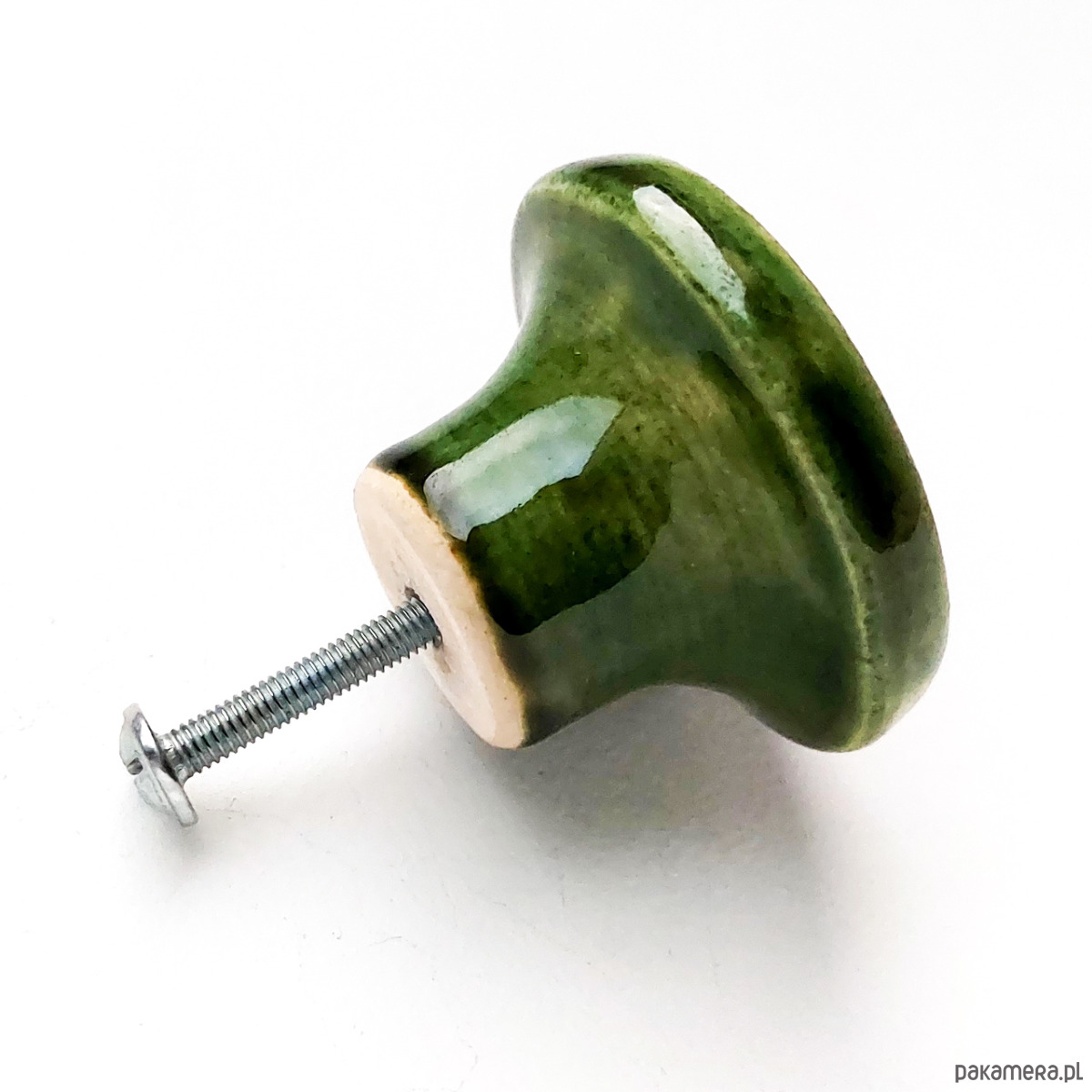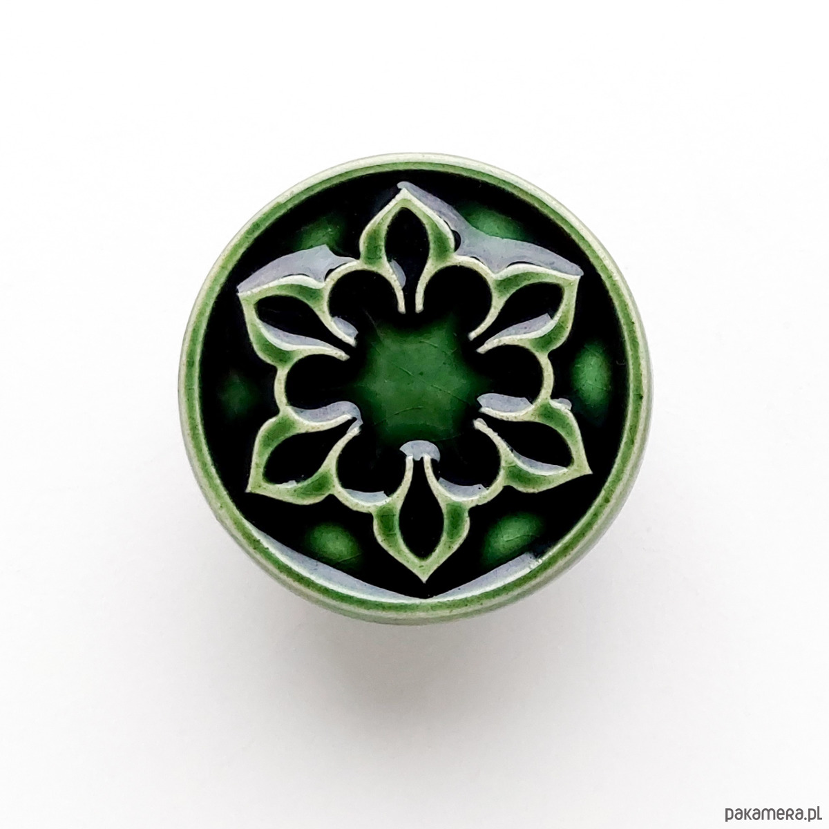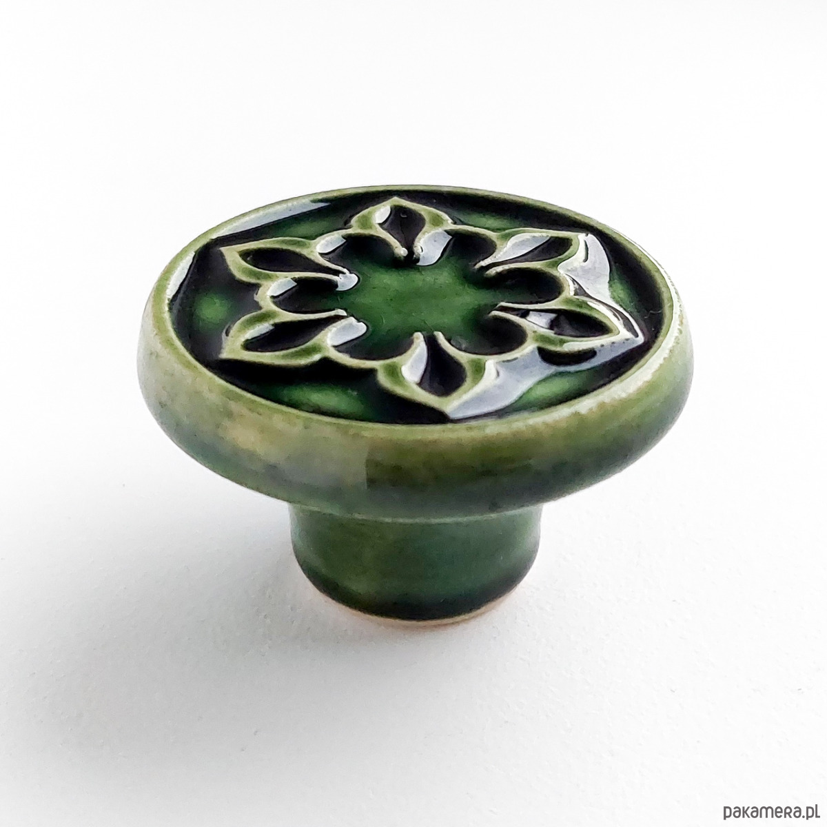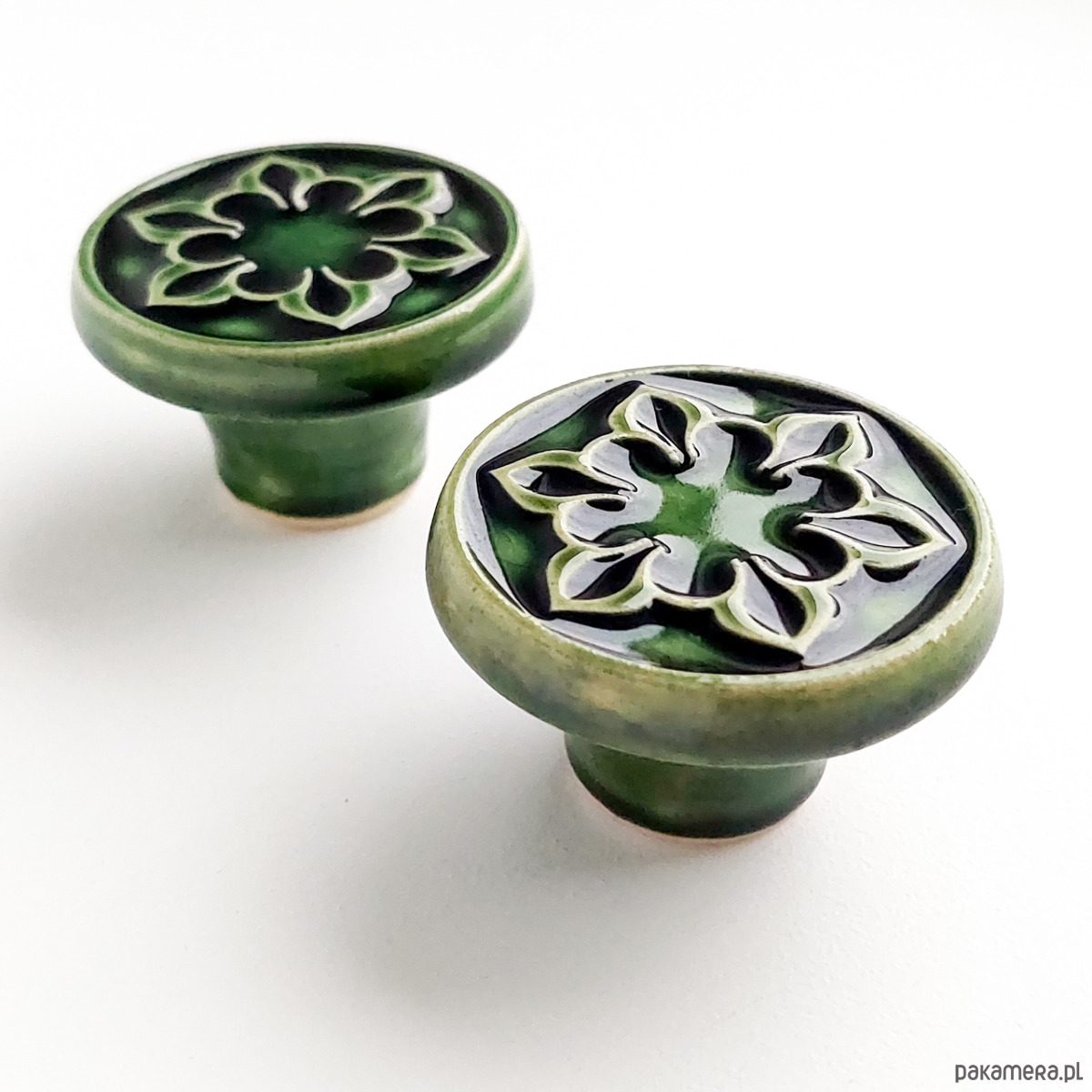Ceramiczne gałki do mebli - ręcznie wykonane, ornamentowe, wg własnego projektu. Wykonane z jasnej gliny, pokryte błyszczącym, ciemnozielonym szkliwem, wypalone dwukrotnie w wysokiej temperaturze.