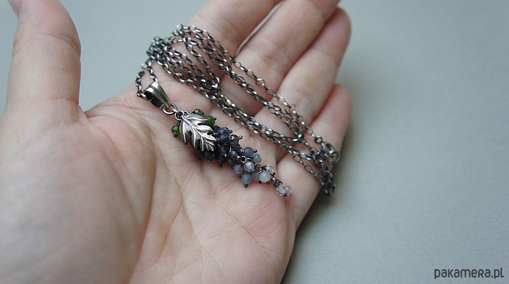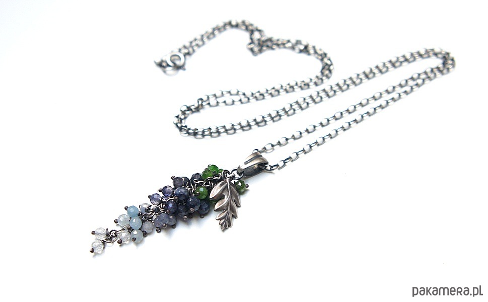 Naszyjnik wykonany ze srebra [pr. 925] w połączeniu z fasetowanymi kuleczkami diopsydów [4mm i 3mm], kuleczkami nefrytów [4mm], szafirami [4mm], fasetowanymi iolitami [3mm], akwamarynami [3mm], topazami [3mm] oraz srebrnym listkiem. Całość oksydowana i przetarta. Całkowita długość kolczyków naszyjnika 65cm.
