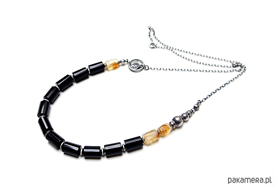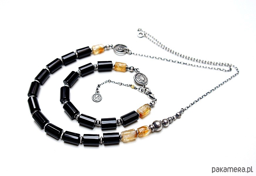 Naszyjnik wykonany ze srebra [pr. 925] w połączeniu z fasetowanymi walcami onyksów [13mm ], bryłkami cytrynów [12mm] -kamienie posiadają naturalne niedoskonałości oraz srebrną imitacją monety . Całość oksydowana i przetarta. Całkowita długość naszyjnika około 61cm . Biżuteria ozdobnie zapakowana.
