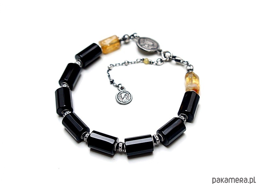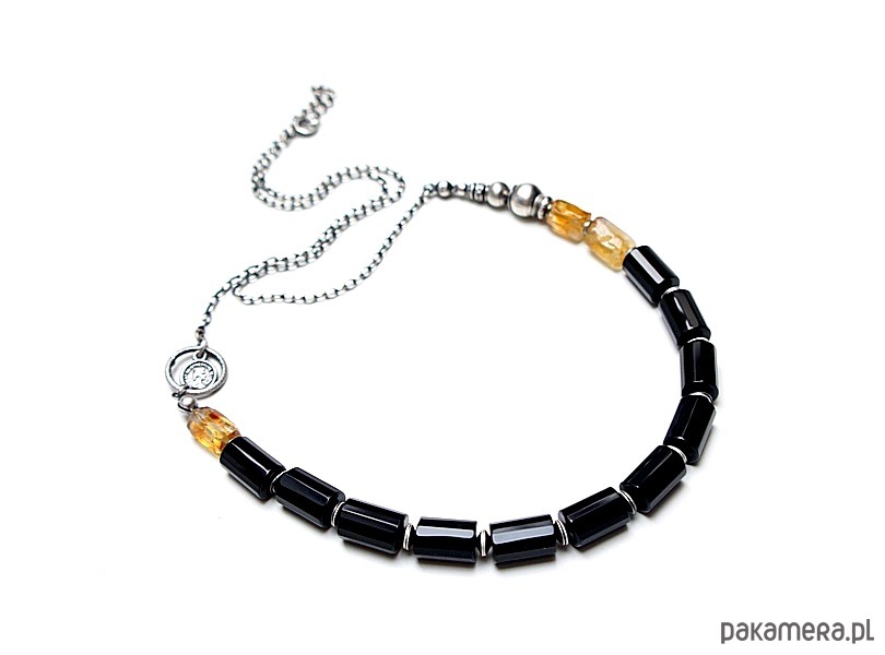 Bransoletka wykonana ze srebra [pr. 925] w połączeniu z fasetowanymi walcami onyksów [13mm ], bryłkami cytrynów [12mm] -kamienie posiadają naturalne niedoskonałości oraz srebrnymi imitacjami monet . Całość oksydowana i przetarta. Całkowita długość bransoletki około 20,5 cm plus ozdobna przedłużka .