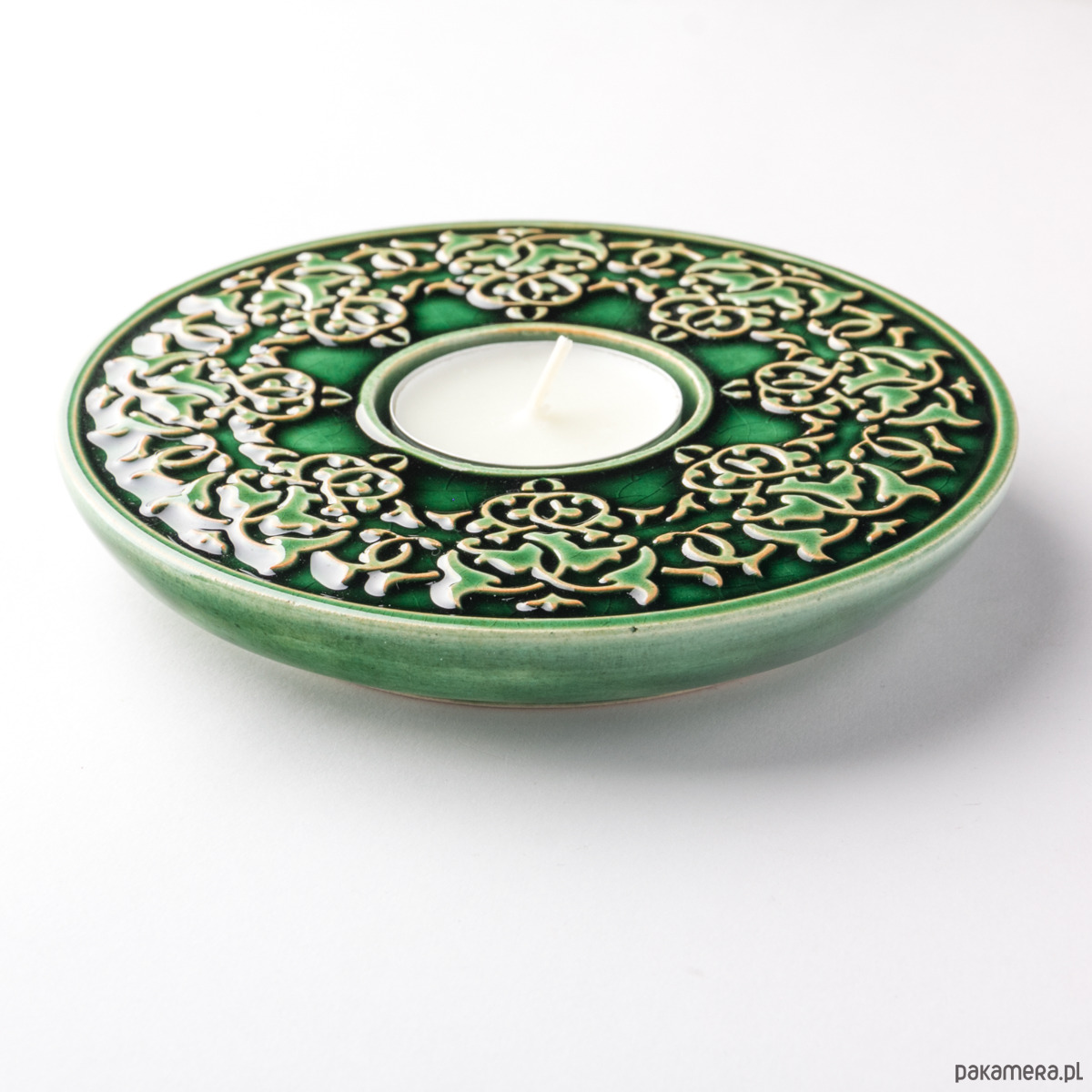 Ceramiczny lampion (świecznik) z lekko wypukłym, roślinnym ornamentem. Wykonany z jasnej gliny, pokryty błyszczącym szkliwem. Od spodu sygnowany. Polecam serdecznie.