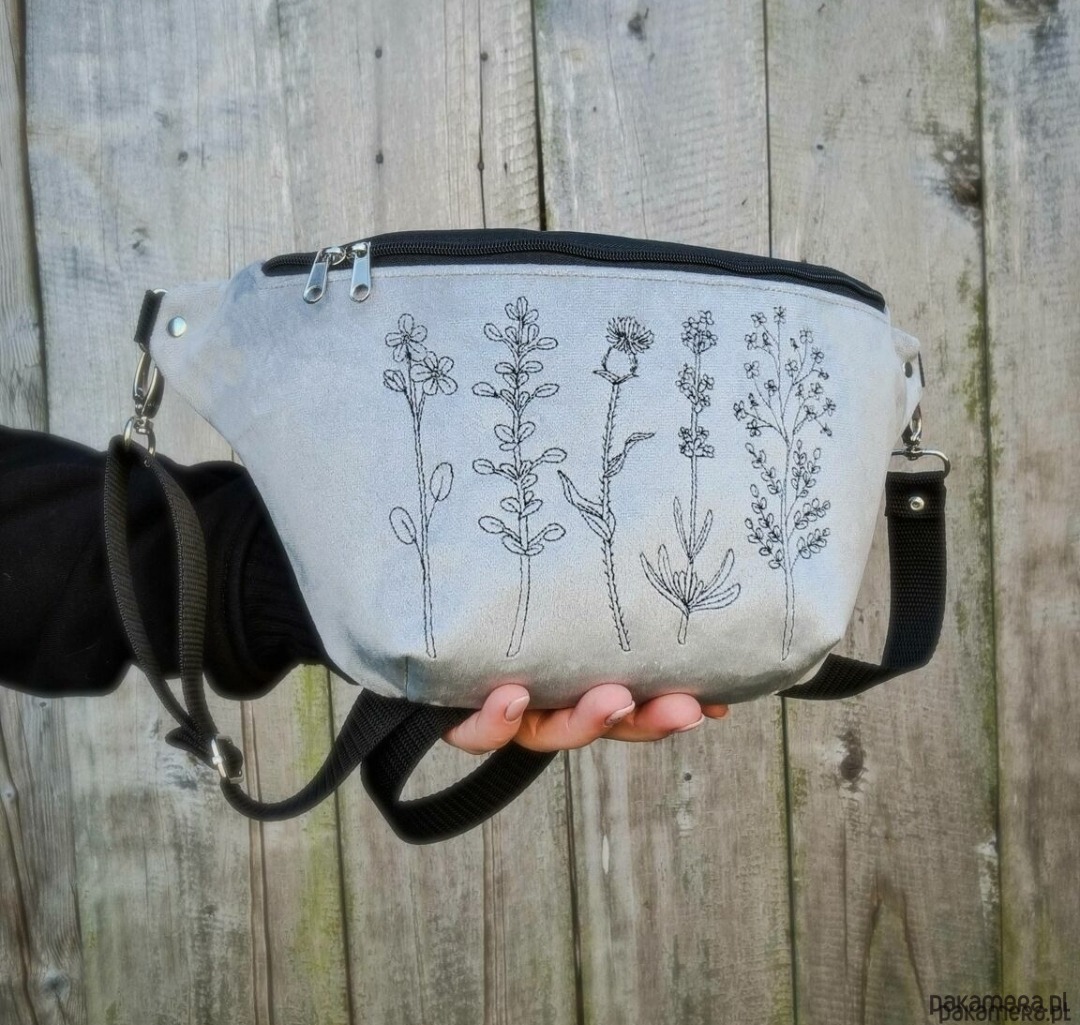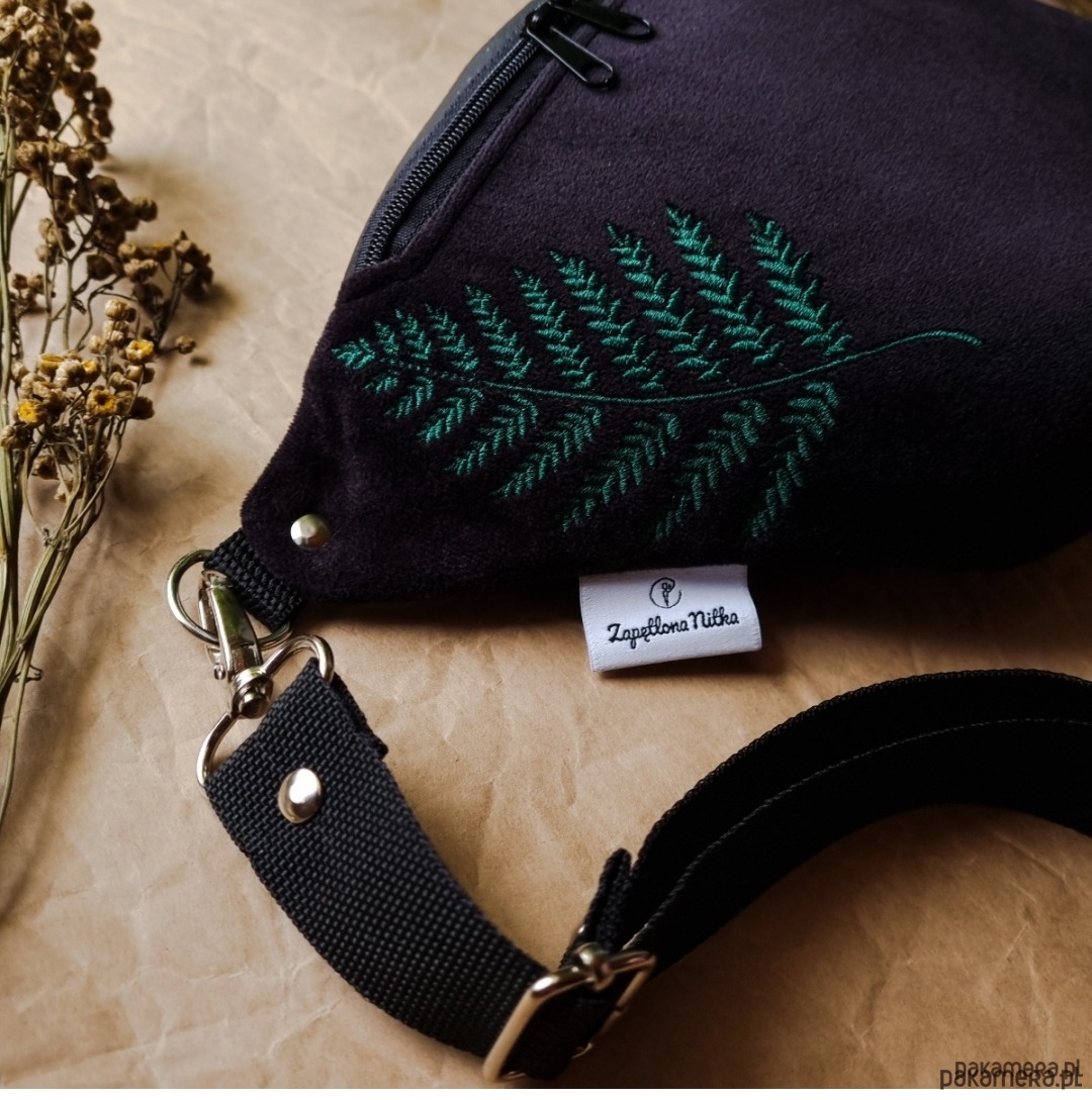 Nerka uszyta z szarego aksamitu (przód nerki), czarny ekoskóry na klapie i tyle nerki. Na przodzie nerki wykonać haft liścia paproci kolor nici butelkowa zieleń. Regulowany pasek nośny z możliwością wymiany (nerka posiada po bokach 2 metalowe półkola, które umożliwiają szybkie zapinanie/ wymianę paska np. na inny kolor). Wymiary: 32cmx17cmx7cm (klapa). Kieszonka w formie przegródki na tylnej ściance (środek nerki). Obwód paska wraz z nerką ma wymiary: minimum 95cm obwód, max 140cm obwód (jeśli interesuje Cię inny obwód paska napisz do mnie wiadomość).