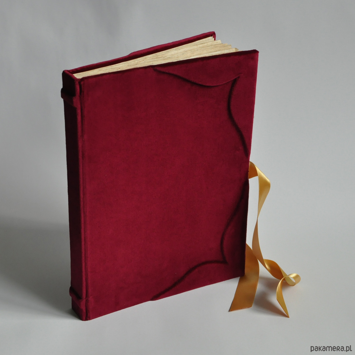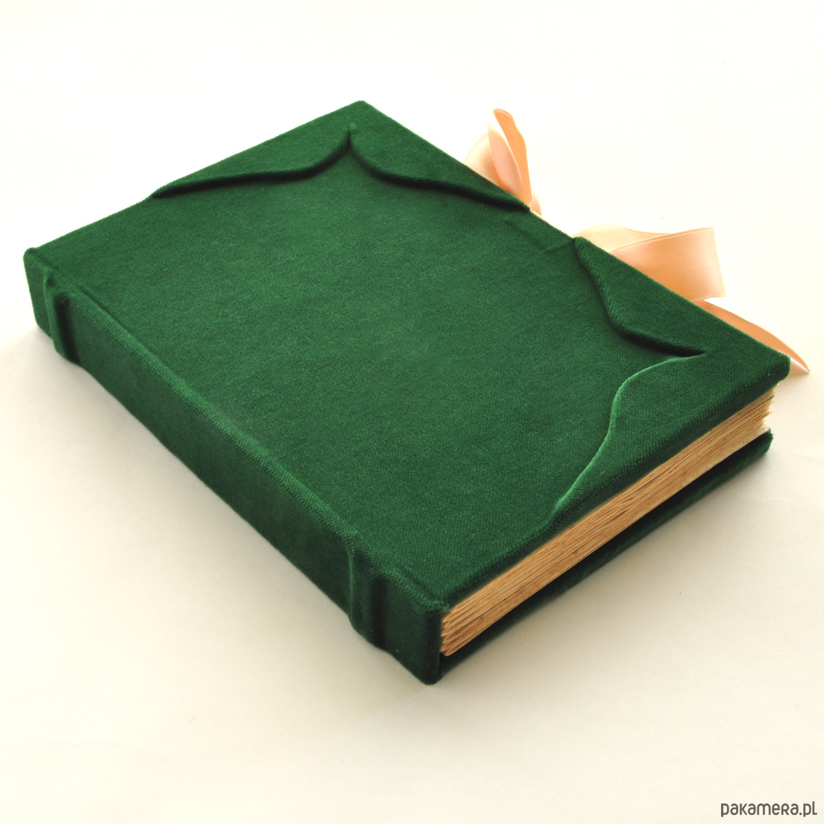 Zielony i bordowy z haftowanymi inicjałami na okładkach.